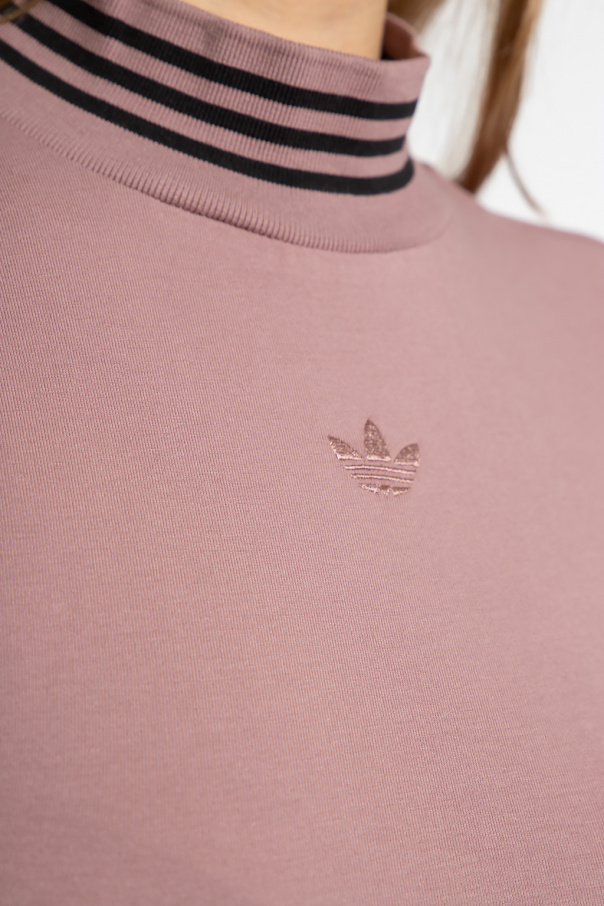 Dark pink top from ADIDAS Originals. Made of cotton, this long sleeve design features an embroidered logo pattern and ribbed trims at the mock neck, hem and cuffs.