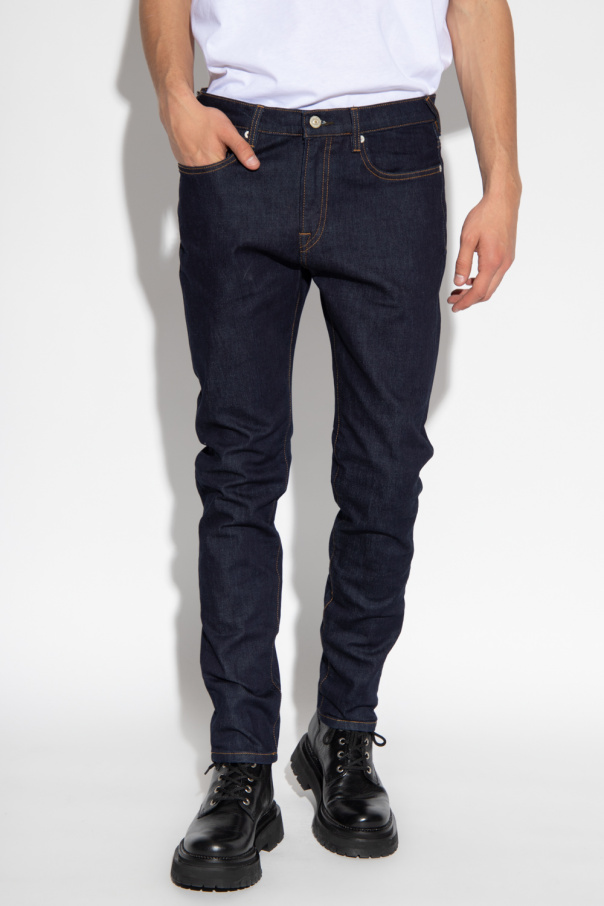 Navy blue slim-fit jeans from PS Paul Smith. Crafted from cotton, this pair features a zip fly with a button, a low-rise waist, beige stitching details, classic five pockets and a back logo patch.