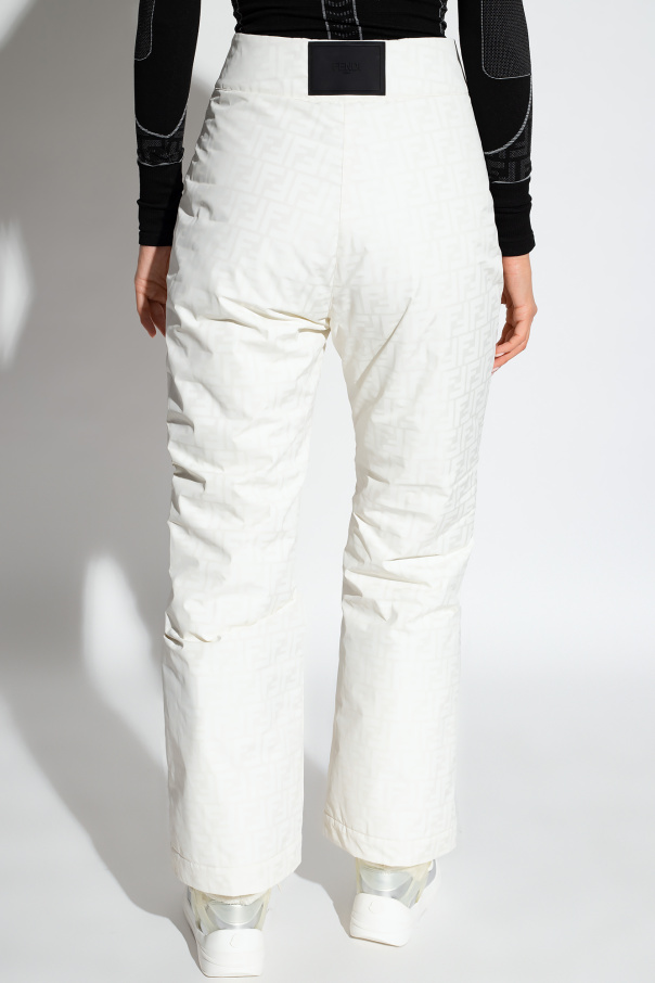 White ski trousers from Fendi. Made of recycled material with a high-rise waist, this pair showcases a monogram pattern, a zip fly with a hook and snaps, two zip pockets, a black rubber logo patch on the back, and an internal leg layer with elasticized cuffs.