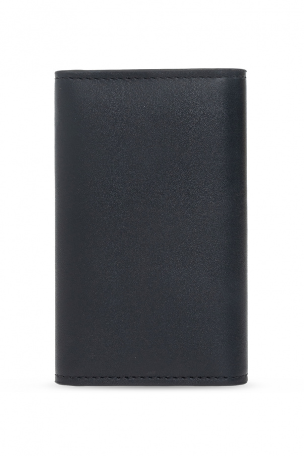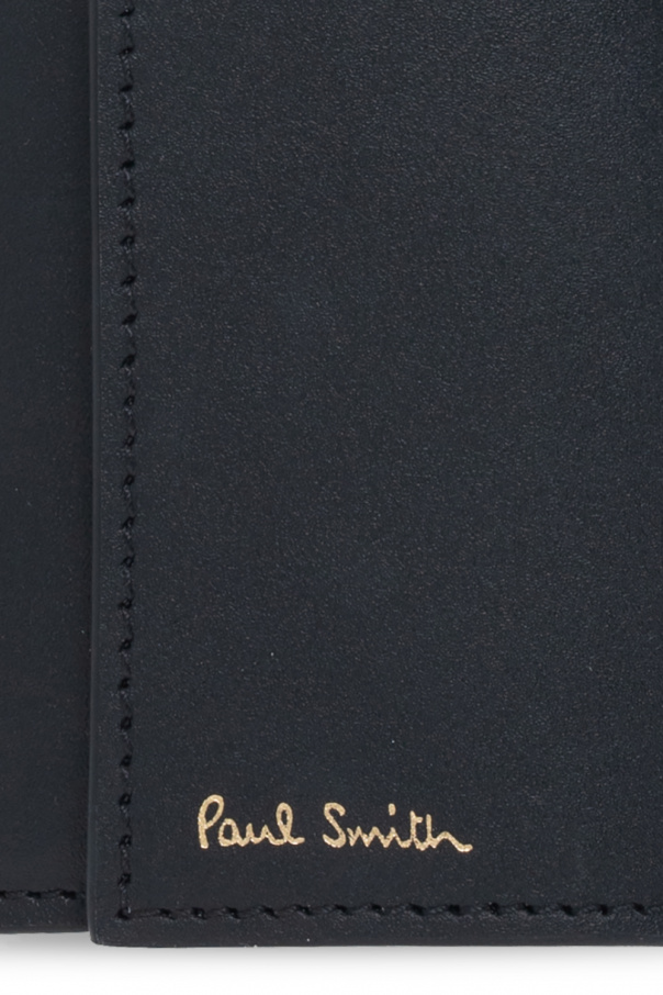 Black leather key case from Paul Smith. Closed with a latch. Decorated with a gold-tone logo. Decorated with the 'Signature Stripe' pattern on the inside. Features slip pocket and six key loops.