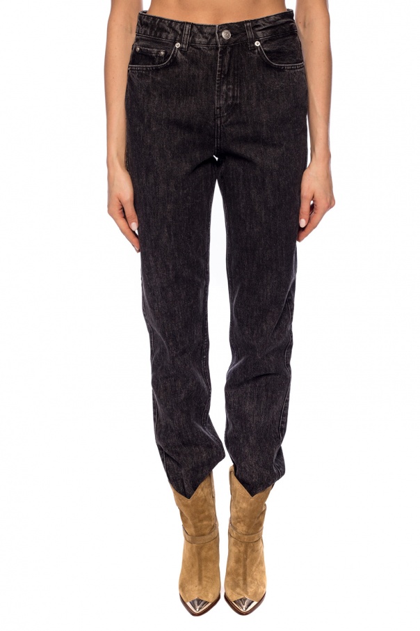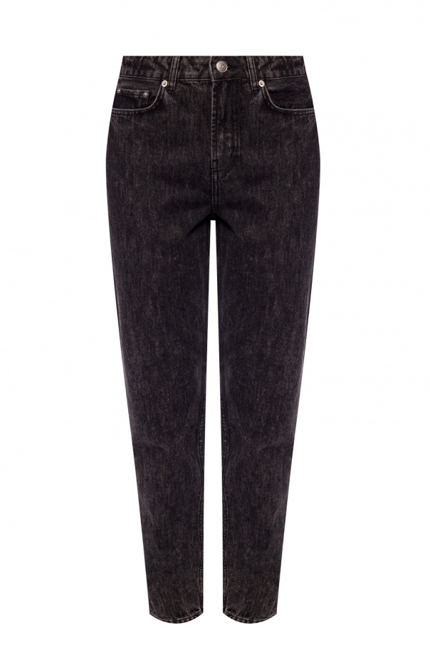 Black jeans from Ganni featuring zip fly with top button fastening, 4 slip pockets, embroidered logo on the rear, tapered legs and grey stonewashed treatment.