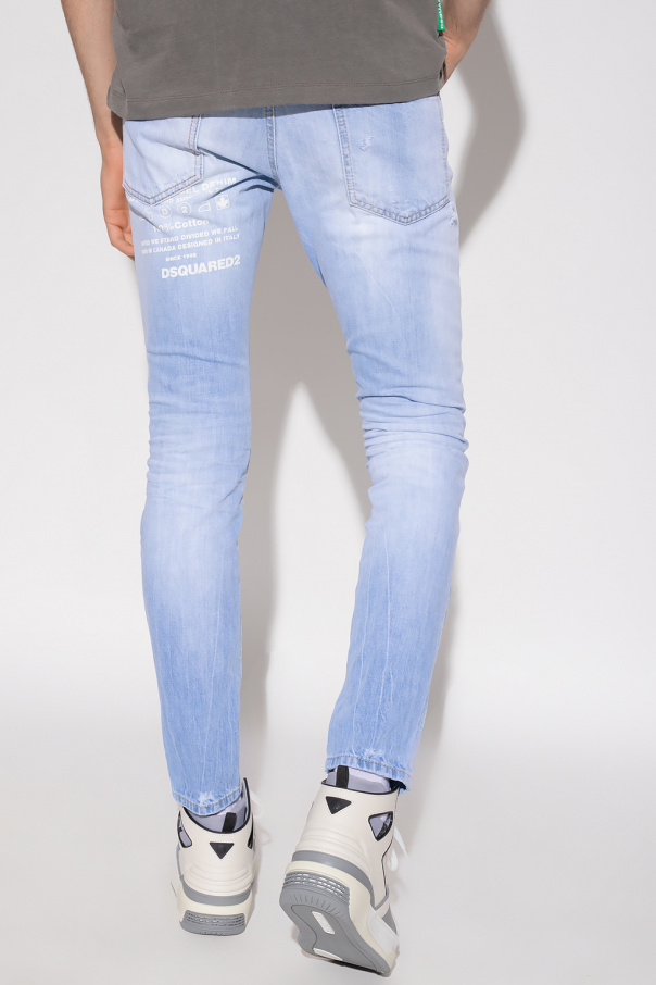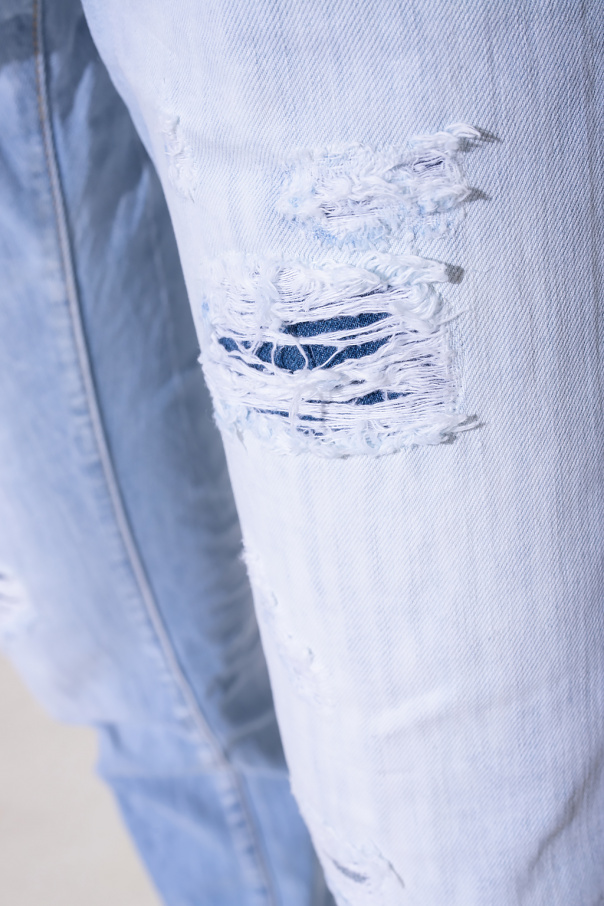 Light blue ‘Cool Guy’ distressed jeans from Dsquared2. Fastened with buttons, this pair is complete with button fastenings, stitching details, logo patch, brown patch, white print, five slip pockets and tapered legs.