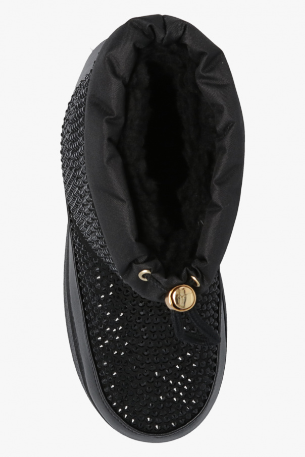 Black ‘GZ Aspen’ snow boots from Giuseppe Zanotti. Crafted from fabric embellished with crystals with leather trims, this pair features drawstring fastening and black rubber sole.