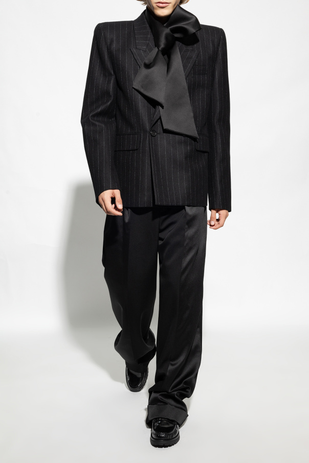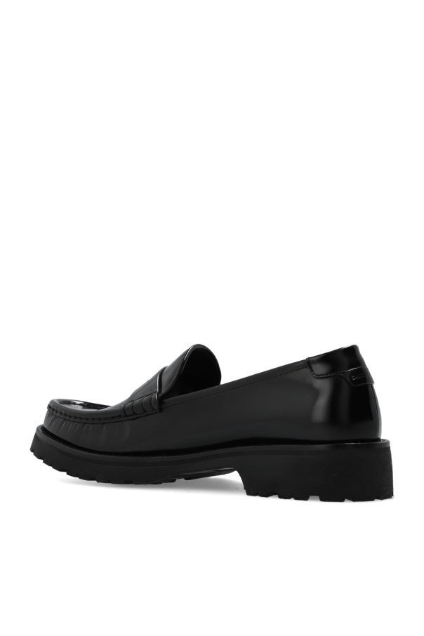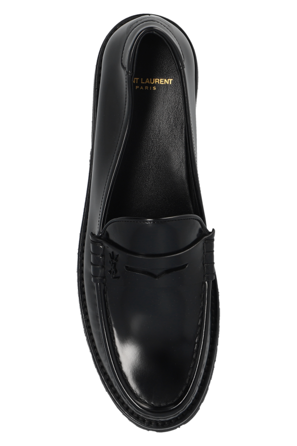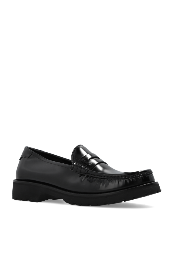 Black loafers from Saint Laurent. Crafted from patent calf leather, this pair features a logo detail and black rubber sole.
