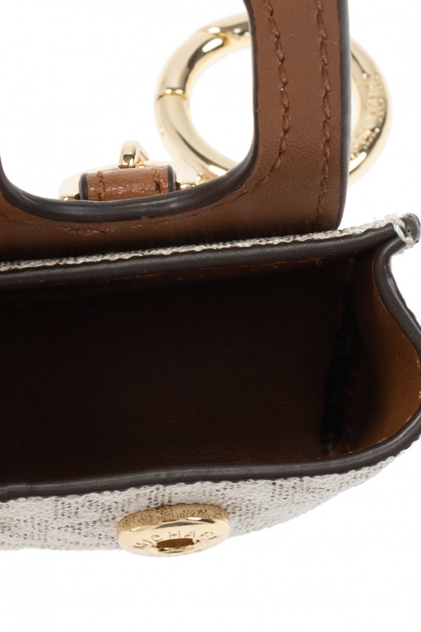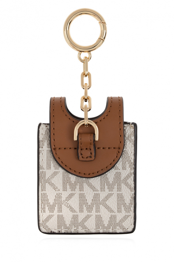 White and brown sanitizer case from Michael Michael Kors. Crafted from monogrammed canvas, this item fastens via a snap and features brown leather trims, a metal logo plaque on the front and a short chain strap with a ring in gold-tone.