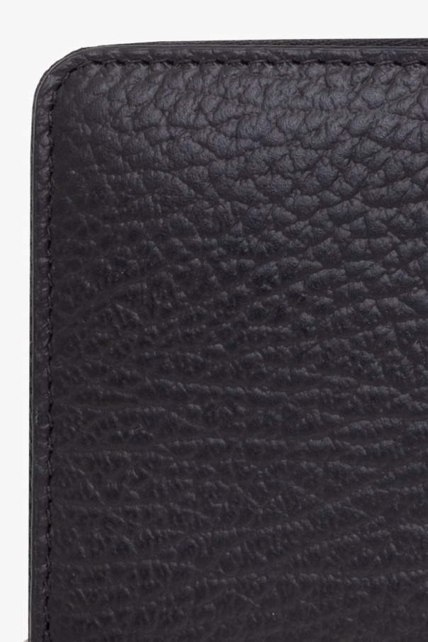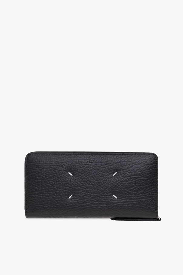 Black wallet from Maison Margiela. Crafted from grained leather, this design fastens with a zipper and showcases the brand's signature white four-stitches moniker, silver-tone metal hardware and one zip coin pocket, four slip pockets and eight card slots inside.