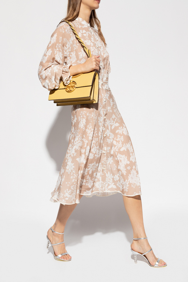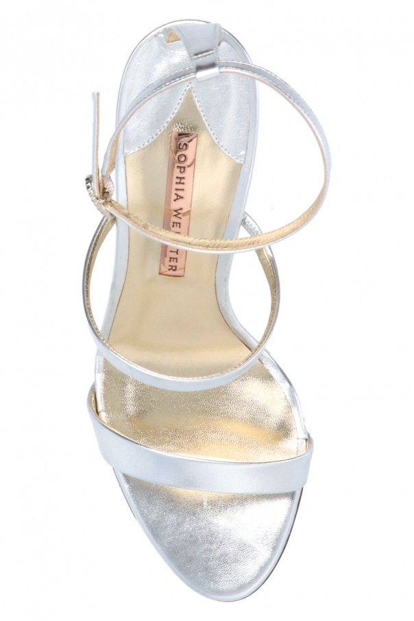 Silver-tone ‘Rosalind’ heeled sandals from Sophia Webster. Crafted from leather, this model secures with a buckle ankle strap and showcases a decorative heel and a beige leather sole.
