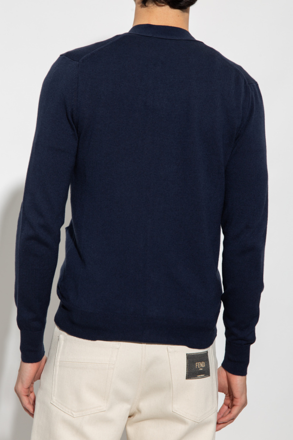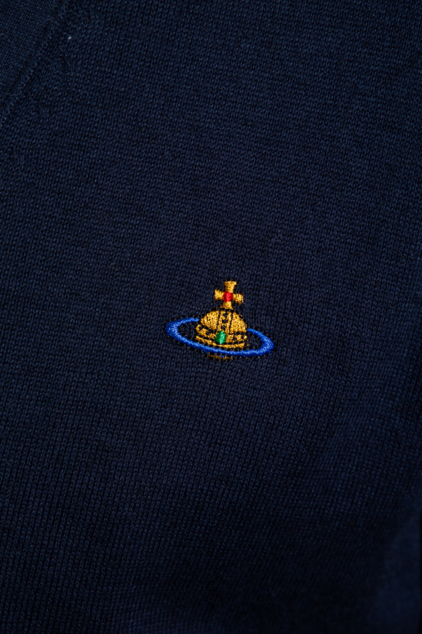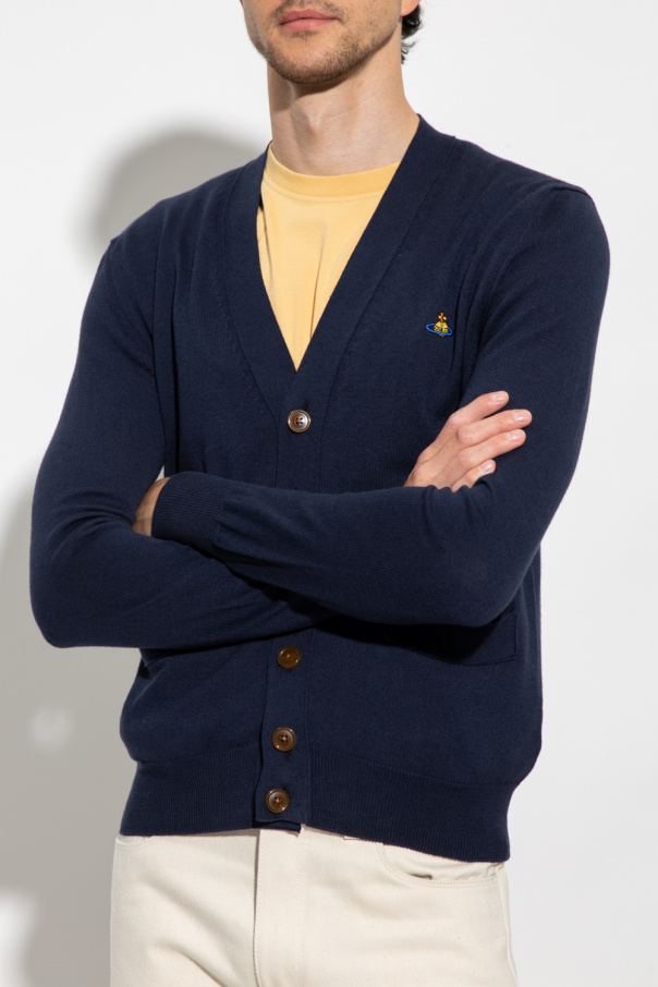 Navy cardigan from Vivienne Westwood. Made of a cotton and cashmere blend, this garment features button fastenings, two slip pockets, multicolored logo embroidery and ribbed trims at the hem and cuffs.