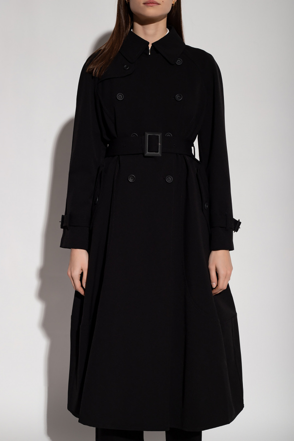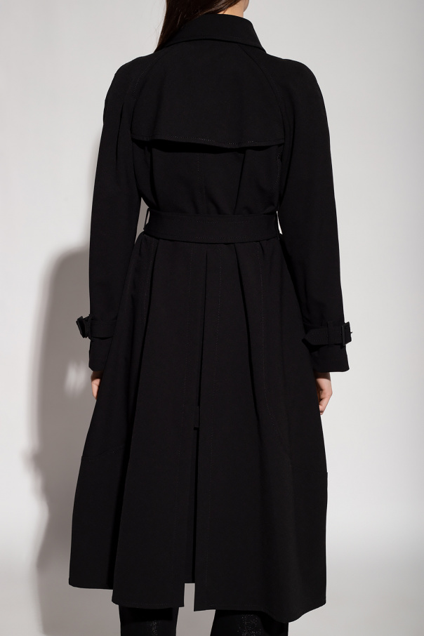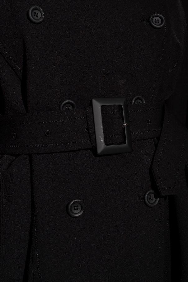 Black double-breasted trench coat from Emporio Armani. Fastened with buttons, this garment features a buckled waist belt, two buttoned front pockets and long sleeves with vents.