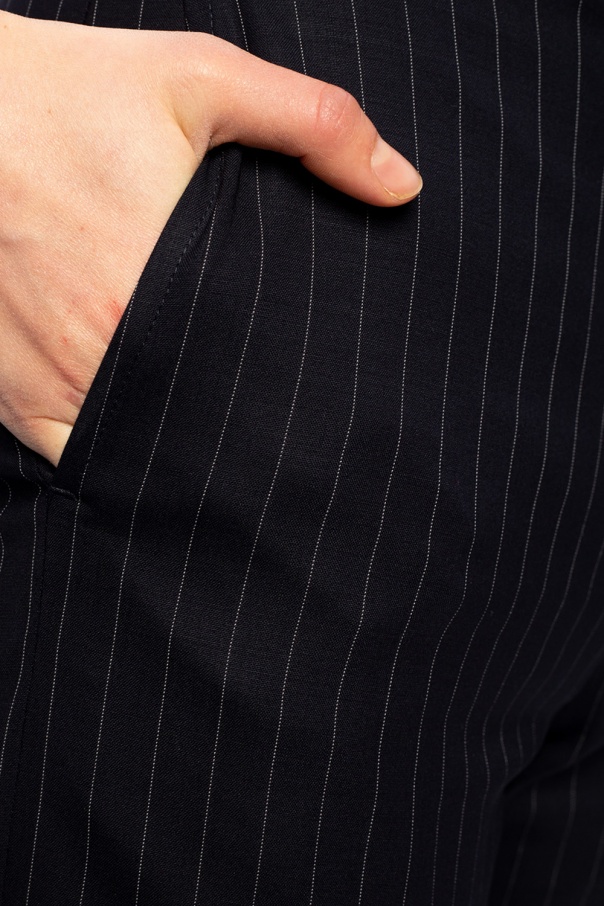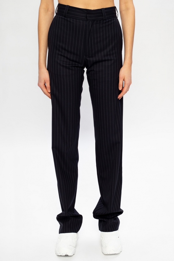 Navy blue trousers from VETEMENTS. Crafted from wool, this pair renders in straight legs white stripes throughout as well as a zip fly with hook & eye closures, two inset front pockets and one welt back pocket.