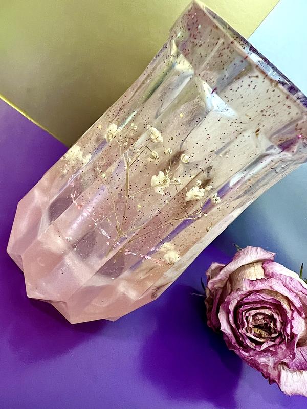 Виготовлено з епоксидної смоли, в середині ціла квітка орхідеї та гілочка сухоцвіту, блискітки, знизу перламутр..