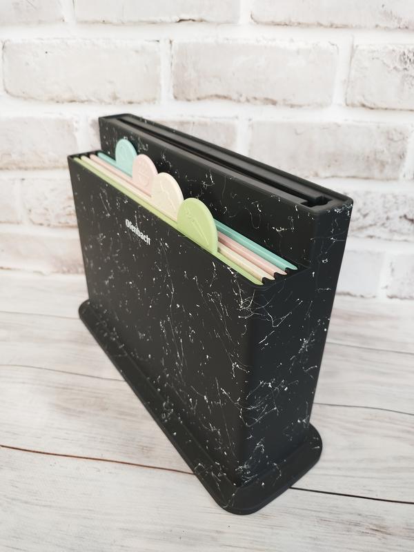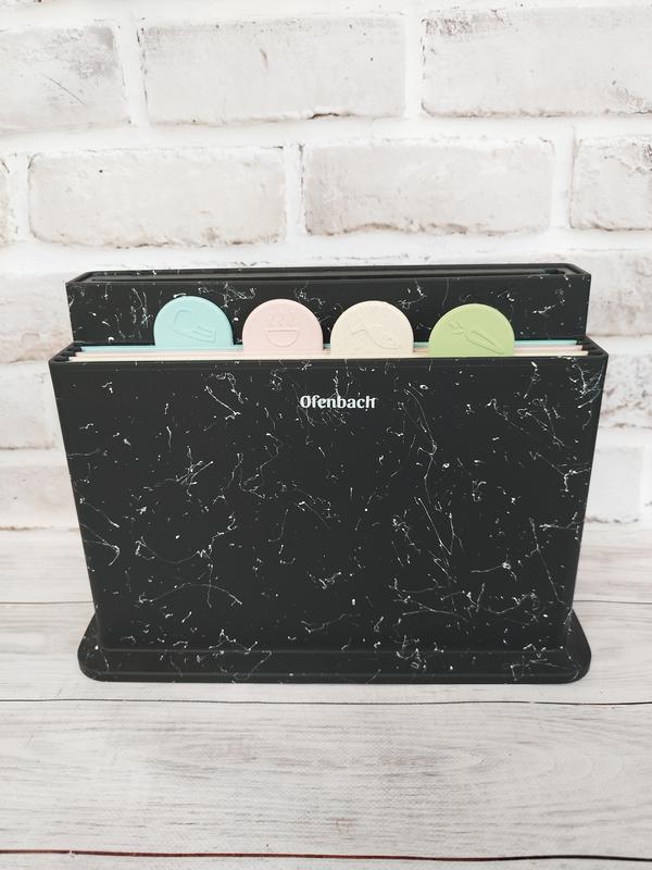 Набор кухонных разделочных досок OFENBACH Black Marble из твердого пластика. Набор включает 4 доски и горизонтальную подставку. Размер досочек: 28х18х0.5см, предназначенные для обработки мяса, рыбы, нарезки овощей и фруктов, на которые указывают ручки-закладки. Текстурная поверхность предотвращает налипание кусочков пищи, а закругленные бока помогают точно положить пищу в посуду. Доски удобно расположены в подставке. Размер блока для ножей: 33х11.5х23.5см. Удачное решение для компактного расположения на кухонном столе. Цвета рабочей поверхности досок - мятный, голубой, розовый и бежевый. Удобный набор и прекрасный подарок