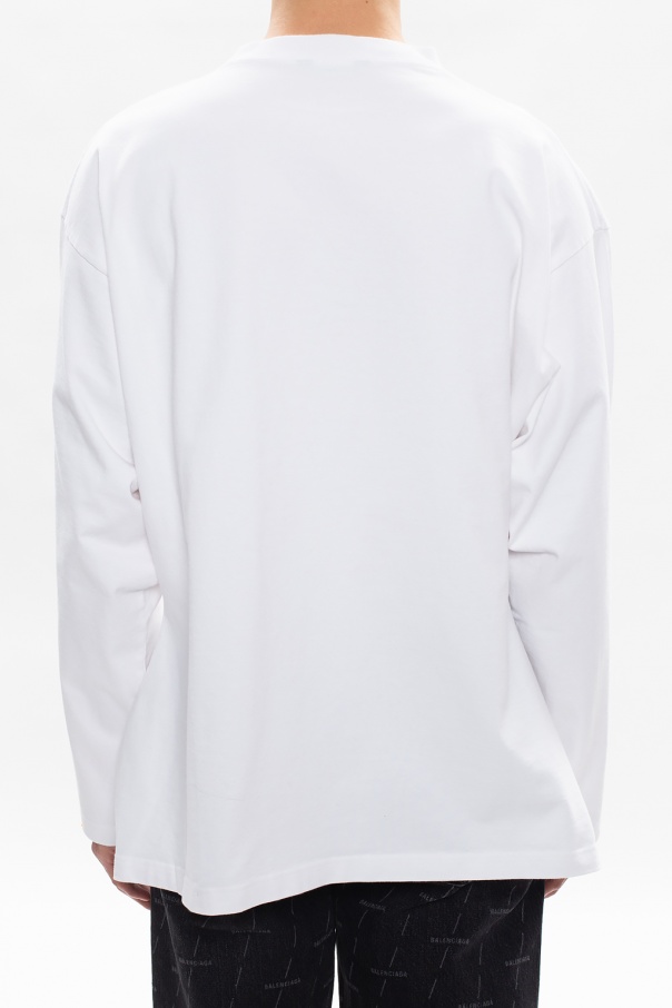 White crewneck T-shirt from Balenciaga. Cut from cotton, this long-sleeved style showcases a black graphic print with the brand's logo across the front.