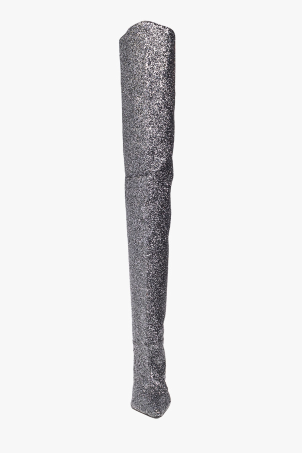 Silver-tone ‘Viola’ heeled ankle boots from Alexander Wang. Made of fabric embellished with glitter, this pointed toe pair features a decorative black appliqué and black leather sole.