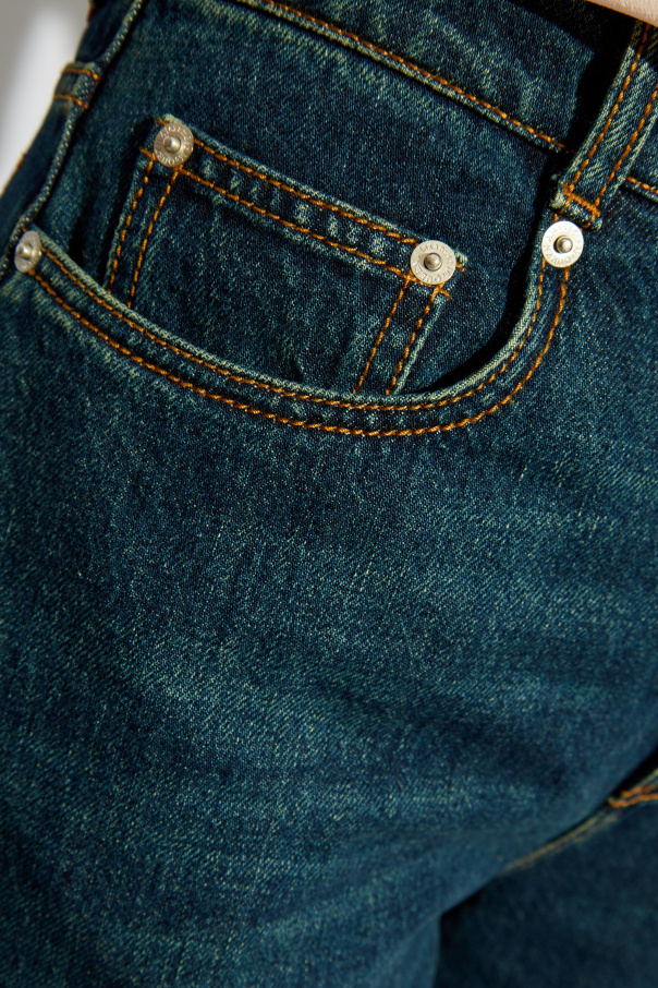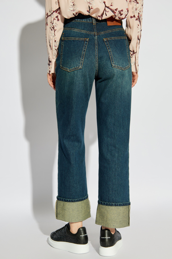 Introducing the quintessence of denim craftsmanship, Alexander McQueen's High-Waisted Jeans. Crafted from 100% cotton, these jeans manifest a homage to the enduring spirit of classic denim while embracing a modern silhouette. The navy hue, enriched with lighter abrasions and natural shade variations, imbues the fabric with the charm of well-worn denim, evoking a sense of timeless elegance. The pair features a traditional five-pocket design, with two front pockets, a coin pocket, and two back pockets, all meticulously finished with a contrasting orange stitch—a nod to the iconic denim aesthetics. The front showcases a button closure, with the buttons themselves acting as a decorative element that enhances the jeans' overall appeal. Notably absent are any patches or logos on the back pocket, suggesting a minimalist approach to branding that is characteristic of some exclusive brands that prefer subtlety over overt recognition. The jeans' wide, turned-up cuffs reveal a contrasting light material inside, adding a unique style twist and allowing for length adjustment. A close examination reveals the high-quality material and solid workmanship that qualify these jeans as a premium collection piece. Why Purchase These Jeans? Exquisite Material: 100% cotton ensures durability and comfort. Attention to Detail: Contrasting stitching and button details exemplify high-quality craftsmanship. Unique Style: Wide, turned-up cuffs offer a stylish flair and customizable length. Minimalist Branding: The absence of overt logos aligns with a sophisticated aesthetic.