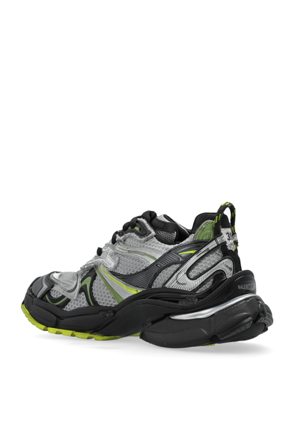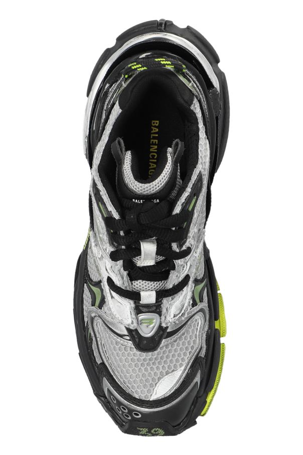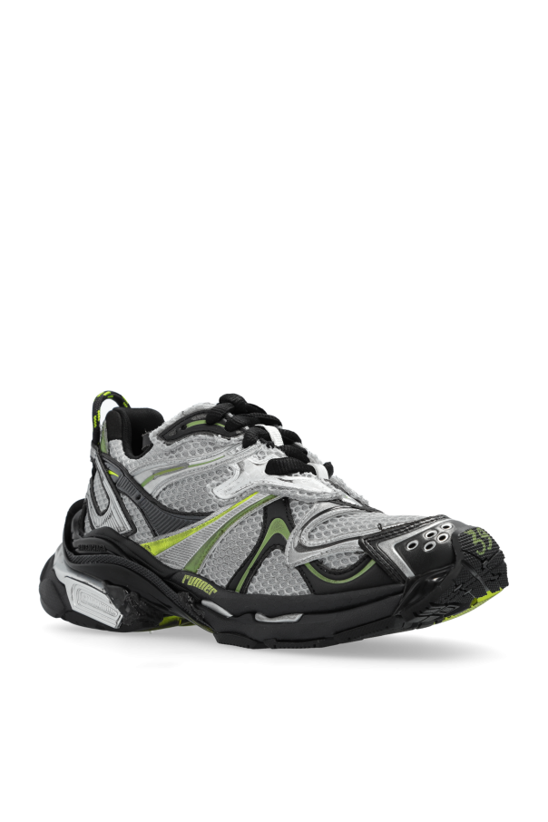 Introducing the Runner 2 sneakers from the esteemed house of Balenciaga, a true embodiment of avant-garde fashion and superior craftsmanship. These sneakers seamlessly blend modern aesthetics with impeccable functionality, making them an indispensable addition to any discerning wardrobe. The dynamic, sport-inspired design features a robust, multi-layered sole, ensuring both durability and style. The upper is meticulously crafted from breathable mesh and synthetic elements, offering an ideal balance of comfort and longevity. The color palette is dominated by a striking silver hue, complemented by accents of black and neon green. A distinctive '39' in white graces the toe, adding a unique touch to the overall design. Signature Balenciaga branding adorns the tongue and heel, accentuated in a vibrant yellow. Equipped with a sturdy sole featuring enhanced cushioning and an aggressive tread pattern, these sneakers promise excellent traction on diverse surfaces. The predominantly black sole is highlighted with neon green accents, infusing a contemporary edge. Why Choose This Product? Exclusive design by Balenciaga, a pinnacle of haute couture. Premium materials for unparalleled comfort and durability. Distinctive color scheme and reflective details for a modern look. Versatile style perfect for casual and streetwear ensembles. Exceptional traction and support with a multi-layered sole.