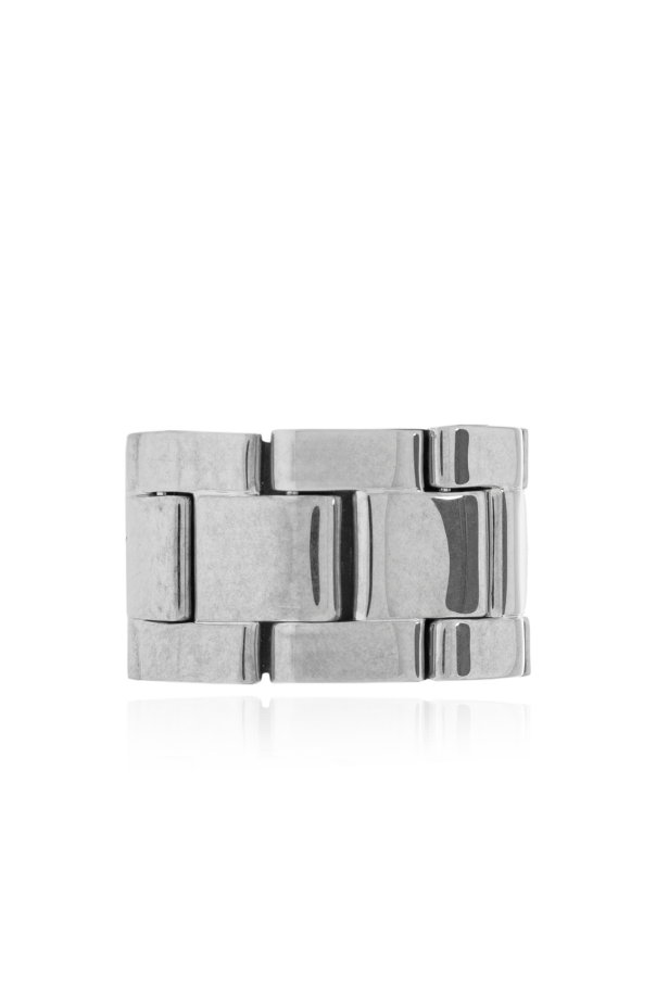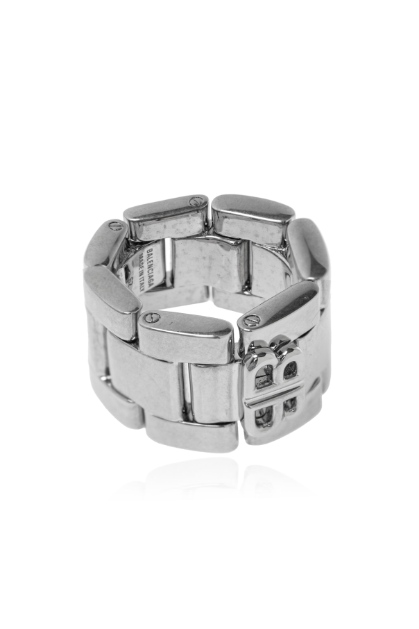 Introducing the pinnacle of avant-garde elegance: the BOYFRIEND Brass Ring by Balenciaga. Crafted with meticulous attention to detail, this piece boasts a robust, matte silver brass construction that exudes sophistication. Its modular design, reminiscent of interconnected segments, creates a captivating visual complexity, while the prominent, geometrically etched logo centrally placed, serves as a bold emblem of the designer's ingenuity. The ring's expansive width and solid build highlight its masculine, yet universally appealing aesthetic—perfectly aligning with the trending unisex fashion. The intricate detailing and three-dimensional logo intensify the ring's uniqueness, making it not just a piece of jewelry, but a statement of style. Its matte finish lends an air of understated elegance, ensuring that the BOYFRIEND Brass Ring stands out in any ensemble as a hallmark of refined taste. Why Purchase This Product? Exclusive Design: A unique, modular design and distinctive logo set this ring apart as a signature piece by Balenciaga. High-Quality Material: Crafted entirely from matte silver brass, offering durability and an elegant aesthetic. Unisex Appeal: Its bold, yet sophisticated design makes it suitable for all genders, adhering to the unisex fashion trend. Designer Recognition: Owning this piece means carrying the iconic Balenciaga emblem, synonymous with luxury and innovation.