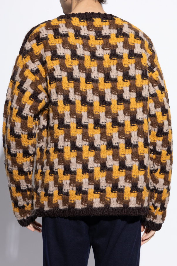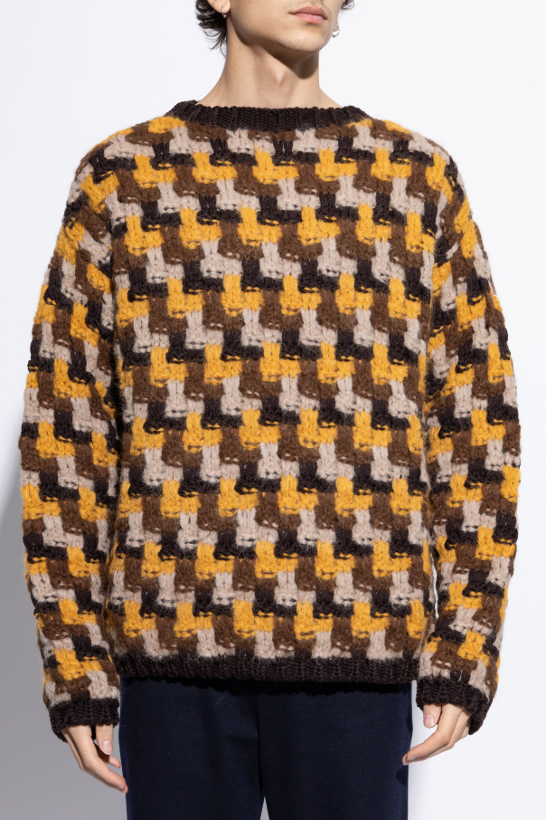 Introducing the MONCLER GRENOBLE APRES-SKI sweater, an epitome of sartorial elegance from the esteemed Moncler Grenoble collection. This garment boasts an exquisite geometric pattern in vibrant hues of yellow, brown, and cream, forming a staircase-like motif. Crafted from a luxurious blend of alpaca, wool, and polyamide, its soft, plush texture promises warmth and unparalleled comfort. The classic cut with long sleeves and a round neckline makes it a versatile staple for any discerning wardrobe. A discreet logo patch subtly embellishes the piece, underscoring the brand's commitment to quality and distinction. The multicolored palette, dominated by shades of yellow and brown, adds a touch of audacity to your ensemble. Why Choose This Product? Exquisite Design: Striking geometric patterns in bold colors. Premium Materials: A rich composition of alpaca, wool, and polyamide. Versatile Style: Classic fit suitable for various occasions. Brand Prestige: Moncler Grenoble's hallmark of excellence.