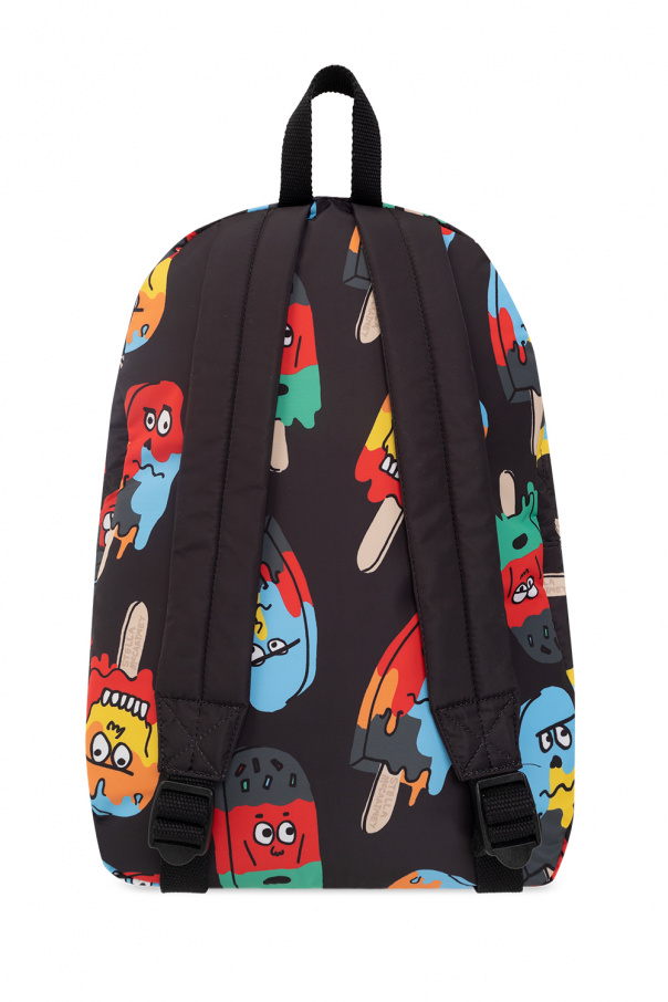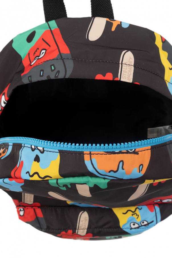 Black backpack from Stella McCartney Kids. Crafted from fluorocarbon-free recycled polyester with water repellent properties, this design features a two-way zip fastening, a graphic print including the brand's logo and a colourful popsicle, a zip pocket on the front, a top half-round handle, adjustable straps and one internal compartment.