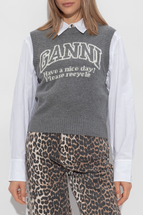 Introducing the exquisite GANNI Sleeveless Sweater, a harmonious blend of timeless elegance and contemporary flair. Crafted in a sumptuous shade of gray, this piece exudes a sense of refined luxury. Meticulously fashioned from a superior blend of wool and recycled fibers, this sweater offers a soft, cozy embrace. The front is adorned with a bold, retro-style white "GANNI" logo, accompanied by the eco-conscious message, "Have a nice day! Please recycle." The classic round neckline and ribbed trims at the shoulders and hem add a touch of sophistication. Whether paired with a crisp white shirt and leopard-print pants for a modern edge or worn solo for a casual chic look, this versatile piece seamlessly transitions from day to night. The impeccable craftsmanship on the plain back underscores its exclusivity. Why Choose This Product? Luxurious and eco-friendly wool blend Striking retro logo design Effortlessly versatile for any occasion High-quality craftsmanship