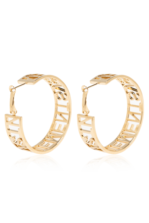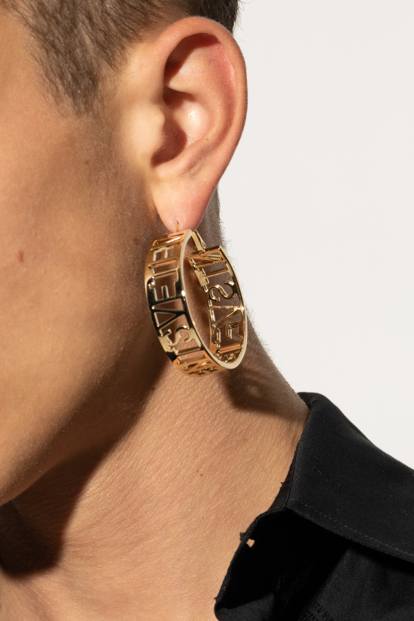 Indulge in the epitome of luxury with these exquisite brass earrings in resplendent gold. Crafted with meticulous attention to detail, these round hoop earrings boast elegantly cut letters that spell out the prestigious name VERSACE, marking them as a statement piece of refined elegance. Constructed from high-quality brass and adorned with a lustrous golden layer, these earrings exude sophistication and timeless charm. The precise cut of the letters ensures smooth and polished contours, adding to their allure. Featuring a traditional hoop clasp, these earrings offer ease of use and secure wear, making them a perfect accessory for any upscale occasion. The dominant golden hue enhances their luxurious appeal, making them a must-have for discerning fashion enthusiasts. Why choose this product? Exclusive VERSACE branding for a touch of opulence. Impeccable craftsmanship with smooth, precise letter cutouts. Durable brass construction with a stunning gold finish. Traditional hoop clasp for secure and comfortable wear. Elegant design that complements a variety of sophisticated outfits.