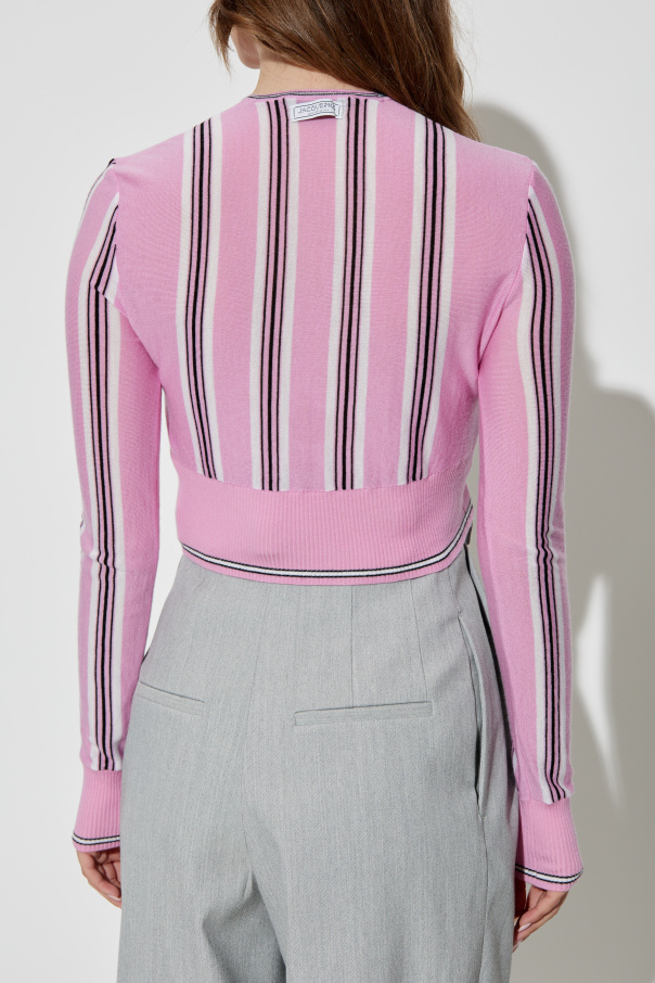 Kardigan Spiaggia by Jacquemus Indulge in the epitome of elegance with the Jacquemus Kardigan Spiaggia, a masterpiece from our exclusive collection. This exquisite cardigan is a perfect blend of sophistication and modernity, designed to elevate your wardrobe. Crafted from premium materials, the cardigan features a dominant pink color adorned with striking vertical stripes in dark pink, black, and white, adding a touch of character and elegance. The short, cropped cut accentuates the silhouette, complemented by long, fitted sleeves and a simple round neckline. The cardigan is meticulously detailed with small, round pink buttons running along the front, and it is finished with wide ribbed cuffs and hem for an added touch of refinement. The logo tag on the upper back is a testament to its designer origin, ensuring authenticity. Why Should You Buy This Product? High-quality, soft, and elastic knit fabric for ultimate comfort and durability. Elegant design with unique vertical stripes for a sophisticated look. Versatile style, perfect for both casual and formal outfits. Authentic Jacquemus piece, showcasing the designer's innovative and modernist approach.