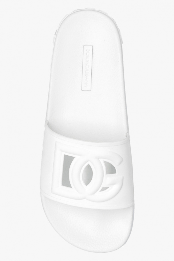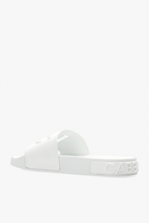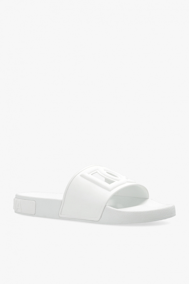 White slides from Dolce & Gabbana. Made entirely from rubber, this model showcases a three-dimensional cutout logo.