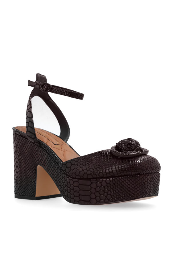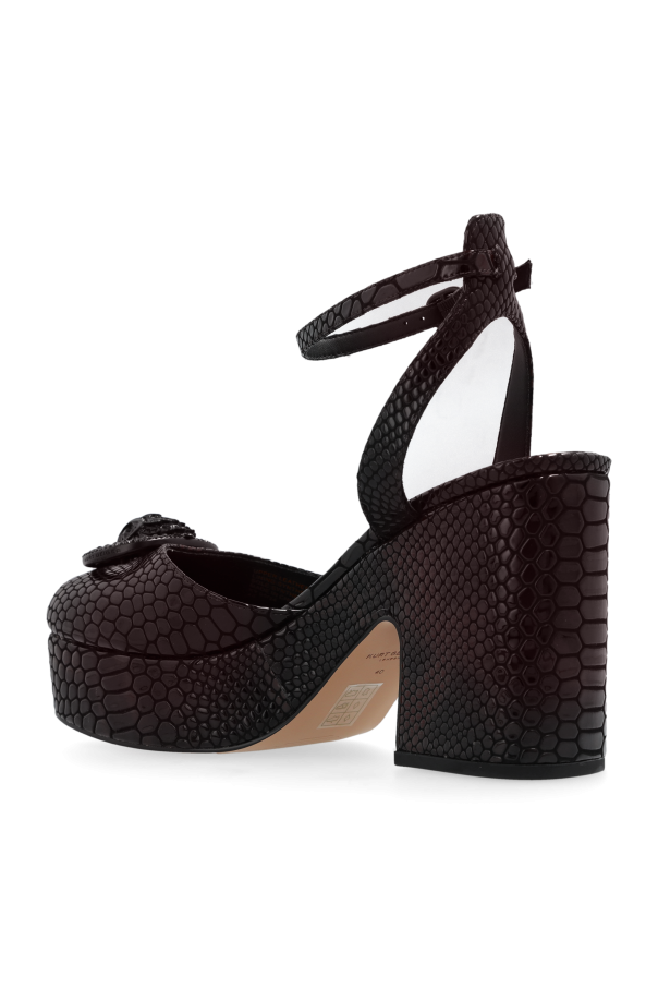 Introducing the Chelsea High-Heel Pumps by Kurt Geiger, an epitome of luxury and sophistication. These elegant heels feature a solid, rectangular high heel and a platform that adds both height and stability. The closed-toe design is embellished with a distinctive circular detail bearing the brand's logo, exuding a refined charm. Crafted from faux snake skin, these pumps boast a luxurious sheen in deep black. The interior is lined with soft, quilted brown leather, ensuring comfort with every step. A golden inscription of "KURT GEIGER LONDON" adorns the insole, adding a touch of opulence. Designed for the discerning fashionista, these pumps come with a sleek, adjustable ankle strap secured by a petite buckle, ensuring a perfect fit. The sophisticated look is completed with a polished finish, making them an ideal choice for elegant soirées and special occasions. Why You Should Buy This Product Exquisite Design: Solid high heel with a platform for added height and stability. Luxurious Materials: Faux snake skin exterior with a quilted brown leather interior. Distinctive Details: Embellished closed-toe with a circular logo detail. Comfort and Fit: Adjustable ankle strap with a secure buckle. Signature Style: Golden "KURT GEIGER LONDON" inscription on the insole.