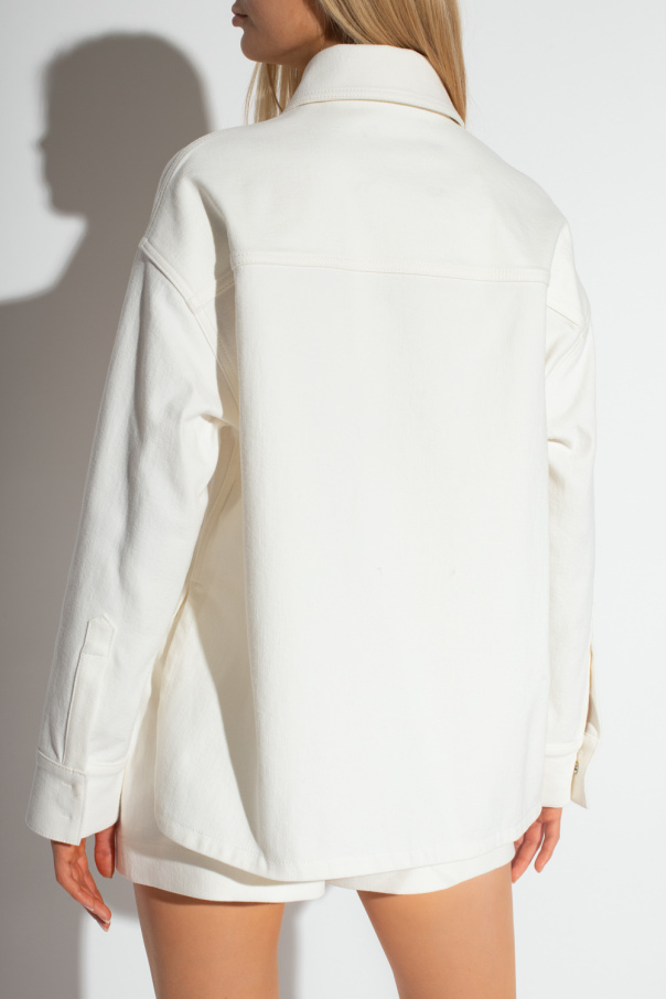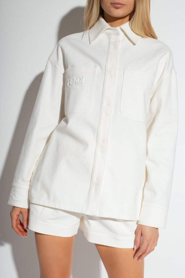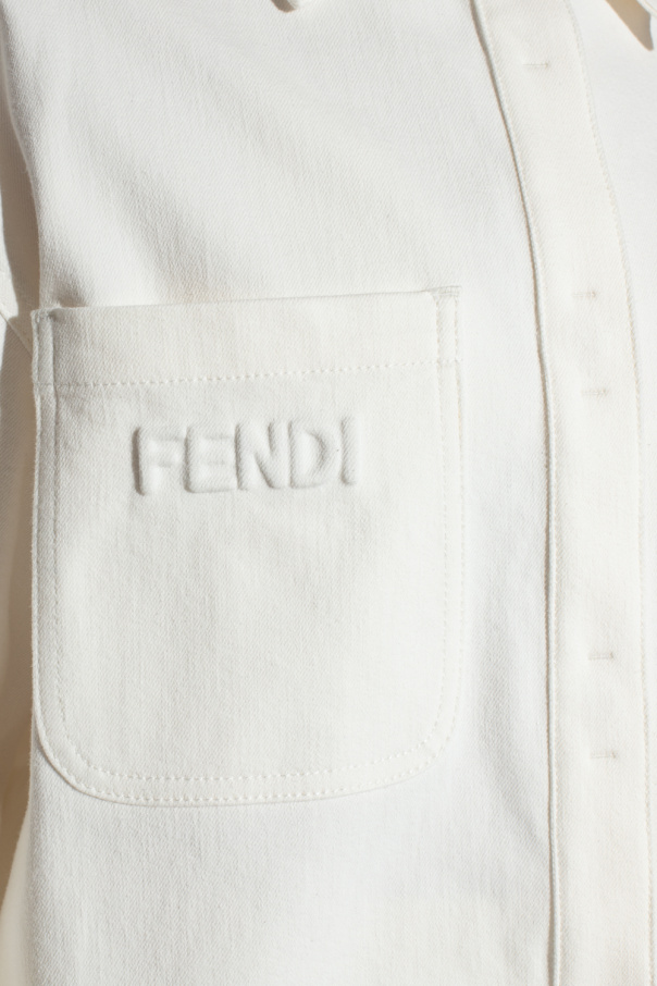 Cream denim jacket from Fendi. Made of cotton, this style features snap closures, a buckle belt at the waist, an embossed logo, two slip pockets, bottom slits and long sleeves with snap-fastened cuffs.