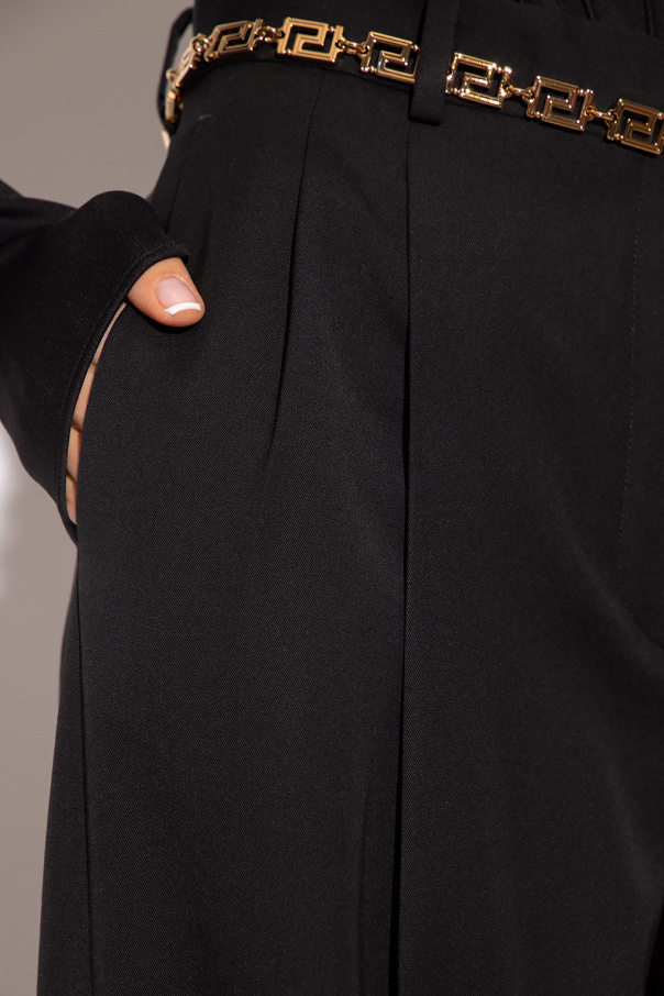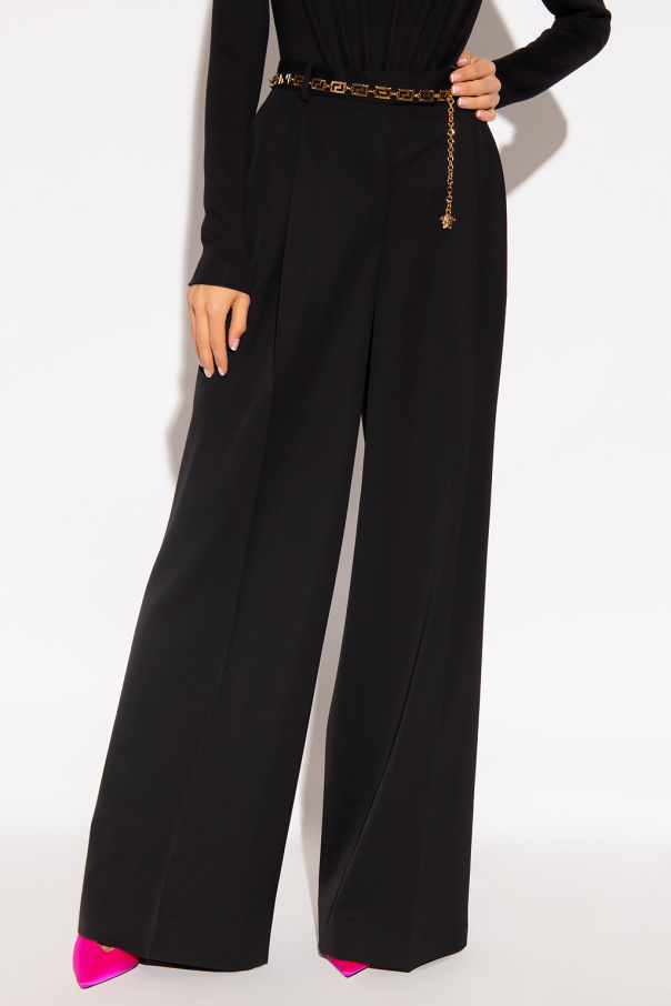 Black trousers from Versace. Made of wool, this pair falls with wide legs and features a zip fly with a button and a hook, pleats at the waist, two side seam pockets and two back button pockets.