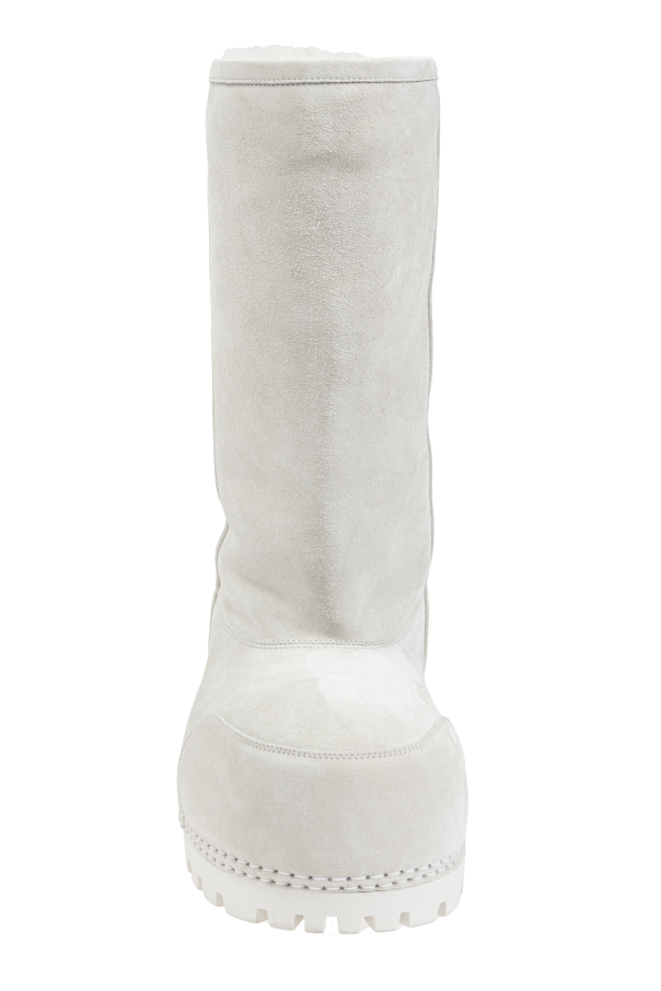 Introducing the ‘Alaska Fur High’ snow boots by Balenciaga, a testament to luxury and functionality seamlessly woven into one. Crafted with an exquisite outer layer of calfskin leather that mimics the soft, matte finish of suede, these cream-colored boots are a pinnacle of high-end winter wear. The boots feature a high shaft that gracefully extends midway up the calf, ensuring both warmth and elegance. The thick sole, adorned with a pronounced tread pattern, is stitched on, promising durability and superior traction in challenging weather conditions, from deep snow to slick mud. The interior is lined with a soft, insulating material, providing snug comfort while braving the cold. Distinctively, the side of the shaft is embellished with the iconic "BALENCIAGA" logo and the size "35," signifying its illustrious brand and attention to detail. Why purchase the ‘Alaska Fur High’ snow boots? Exclusive Design: Stand out with Balenciaga's cream-colored elegance and high-caliber craftsmanship. Supreme Comfort: Enjoy the cozy warmth offered by the premium internal materials, perfect for cold climates. Enhanced Durability: The robust, treaded rubber sole ensures long-lasting wear and slip-resistant safety. Signature Appeal: Showcase your taste with the distinguished Balenciaga logo, a symbol of luxury and style.