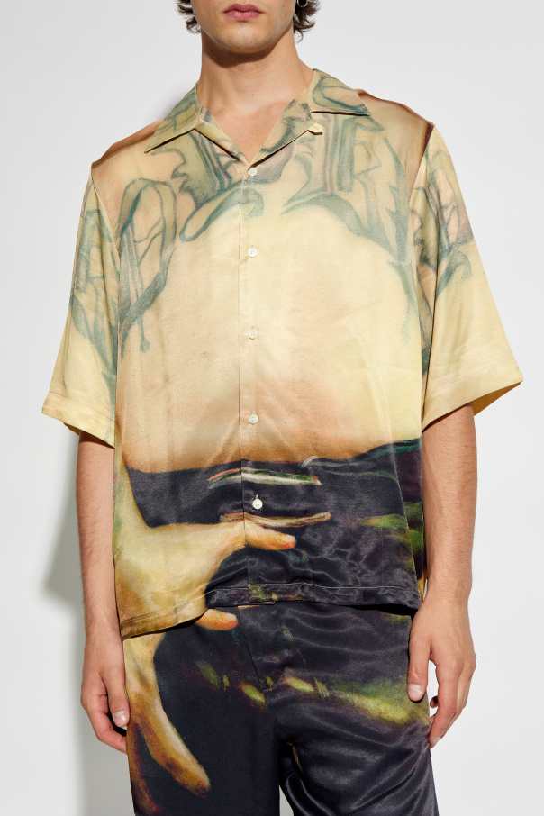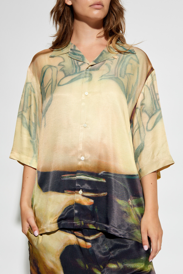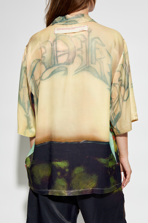 Introducing the exquisite Diesel x Tom Of Finland Foundation short-sleeved shirt, a sartorial masterpiece that embodies the essence of avant-garde artistry. Crafted from 100% viscose, this garment offers an unparalleled blend of comfort and durability, ensuring a breezy feel with a touch of synthetic resilience to preserve the vibrancy of its print and the integrity of its form. The shirt flaunts a captivating multicolored pattern that mirrors an artistic tapestry, blending bright and dark hues dominated by shades of yellow, green, and black. At its core, abstract forms reminiscent of plant fragments or leaves in the upper section transition into a striking depiction of hands against a dark backdrop in the lower section, creating a visual narrative that is both mesmerizing and profound. Adorned with a classic collar and white button fastening at the front, this garment is a nod to traditional elegance, while the signature red Diesel logo on the left collar injects a dash of contemporary flair. The back of the shirt echoes the thematic artwork, with leaf-like lines in the upper part gradually darkening towards the base, further accentuating its unique allure. Why Purchase This Product? Exclusive Diesel x Tom Of Finland Foundation collaboration, offering a unique blend of fashion and art. Lightweight and breathable material, perfect for warm weather or layering. Striking multicolored abstract and figurative print that stands out in any crowd. Elegant design with classic collar and button closure, versatile for various occasions. Embellished with the iconic red Diesel logo, symbolizing quality and cutting-edge style.