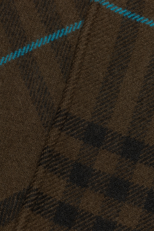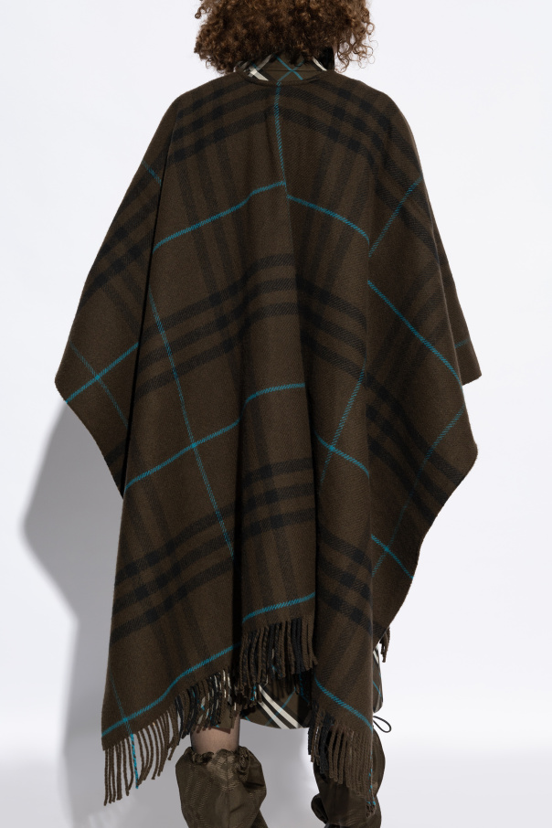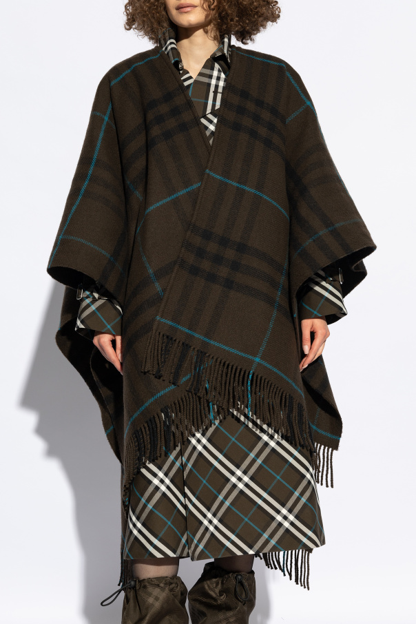 Introducing an exquisite addition to your autumn and winter wardrobe: the Burberry Wool-Cashmere Poncho. Crafted from a luxurious blend of 54% wool and 46% cashmere, this poncho promises unparalleled warmth and softness. Its elegant brown hue is complemented by a distinctive plaid pattern, featuring bold, dark brown lines interwoven with subtle, light blue accents, creating a visually captivating contrast. The poncho boasts a generous, rectangular silhouette, offering a fluid drape that effortlessly accommodates layering over other garments for added warmth and style. Its edges are tastefully finished with fringes, adding a touch of whimsy to its overall sophisticated appearance. The material's thickness and texture are palpable in close-up images, underscoring the garment's quality and cozy feel, ideal for chillier seasons. Notably absent are any conspicuous logos or branding, highlighting Burberry's commitment to minimalist design and focusing attention on the poncho's refined aesthetic and exceptional craftsmanship. Its loose, relaxed fit ensures ease of wear, making it a versatile piece for any sophisticated ensemble. Why Purchase This Product? Luxurious blend of wool and cashmere for supreme warmth and softness. Unique plaid pattern with striking color contrast adds visual interest. Designed by the iconic Burberry, synonymous with high-quality craftsmanship. Minimalist design enhances versatility and timeless appeal. Perfect for layering, offering both comfort and elegance during the cooler months.