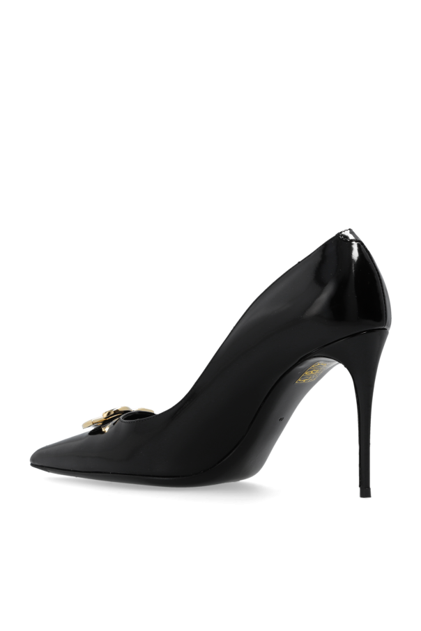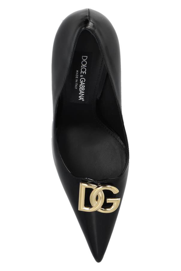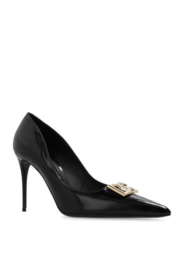 Black pumps from Dolce & Gabbana. Crafted from patent calf leather, this pair features a gold-tone logo detail on the front, pointed toe and black leather sole.