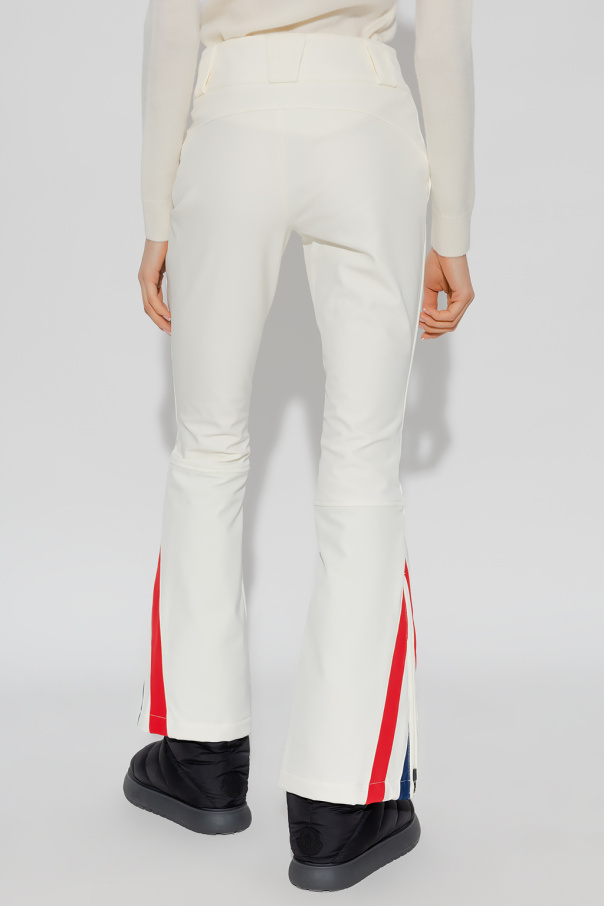 Cream ski trousers from Perfect Moment. Crafted with improved fabric with a 4-way stretch and breathable and windproof properties to protect your from the elements, this pair fastens with a zipper and snaps and features two zip pockets, an embroidered logo and flared legs with zipped cuffs.