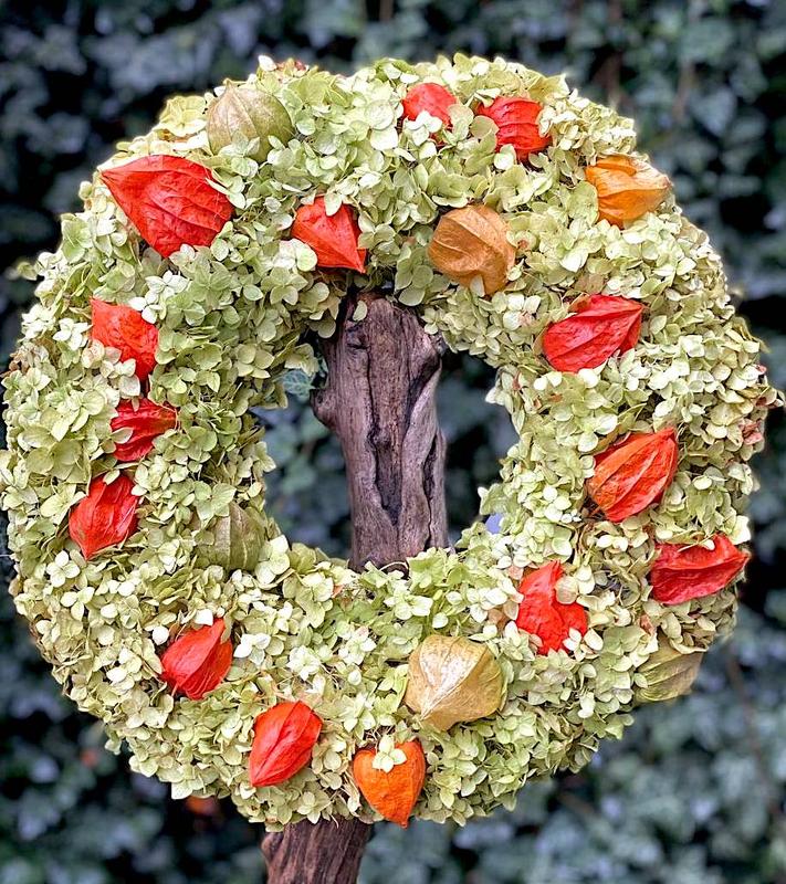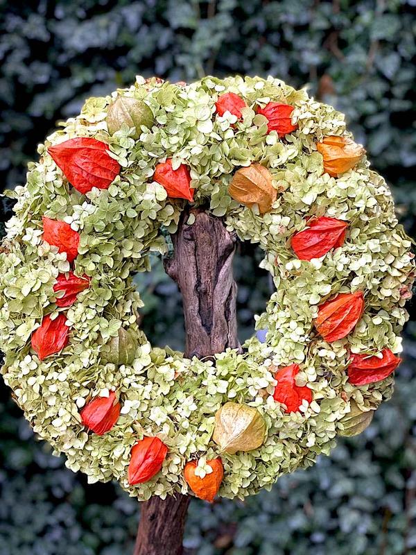 В тихом уголке сада, где осень уже рассыпала свои золотые листья, стоит волшебный венок из светящихся фонариков физалиса и зеленой гортензии. Кажется, что это творение создано самой природой, ведь каждый элемент этого венка подобран с такой тонкостью и мастерством, что просто невозможно поверить в человеческие руки. Светлячки в сумерках освещают этот шедевр, придавая ему еще больше мистики и очарования. Фонарики физалиса горят ярким оранжевым светом, словно маленькие солнца, согревающие прохладную осеннюю ночь. Зелень гортензии добавляет свежести и жизни, напоминая о том, что даже в холодные дни можно найти красоту и тепло. Это произведение искусства создает атмосферу сказки, где каждое мгновение наполнено магией и чудом. Диаметр венка около 37 см. Внутрь соцветий физалиса вставлены лампочки гирлянды, батарейки в комплекте.