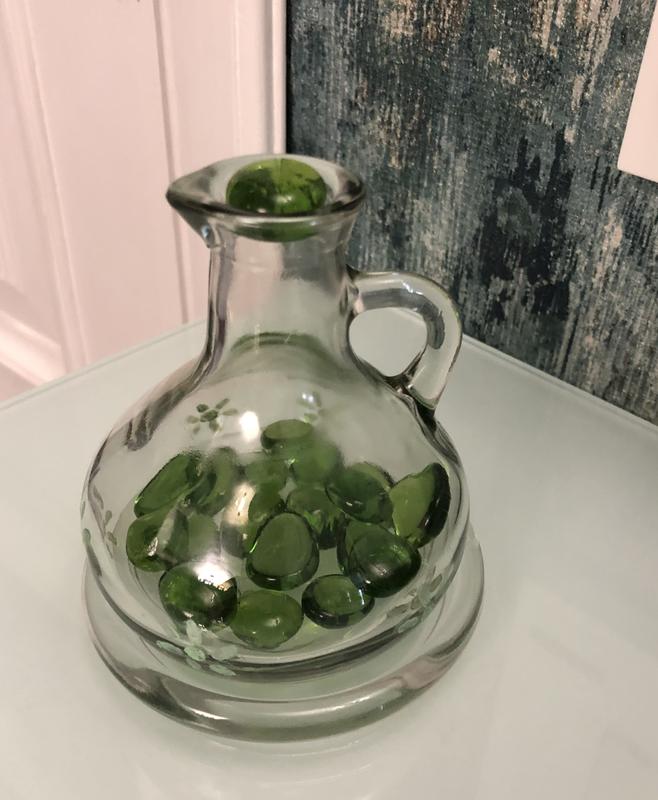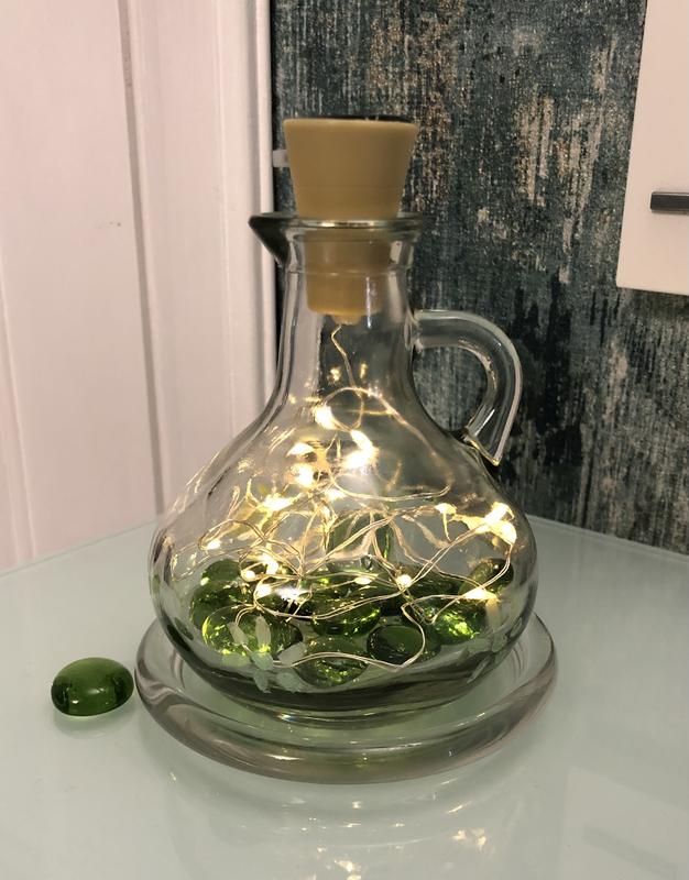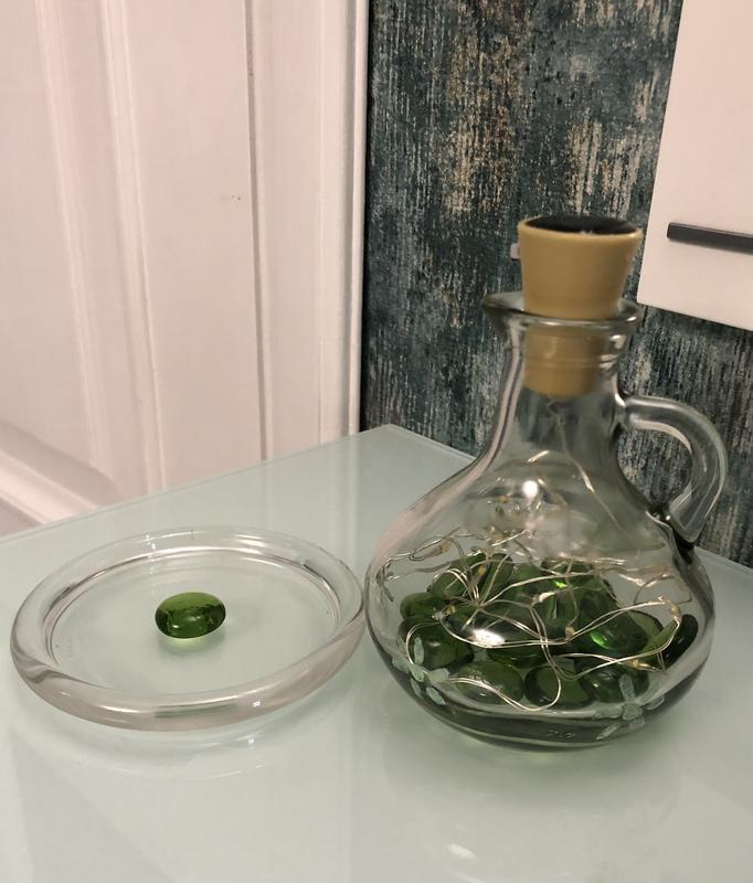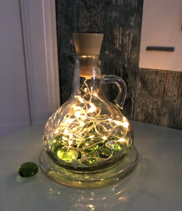 Прекрасный маленький стеклянный кувшин заполненный зелеными камушками и солнечным сиянием. Стеклянная плоская подставка может использоваться самостоятельно, как подсвечник. Отлично смотрится и без освещения, если вы вдруг пожелаете. Декор для дома, террасы, веранды, сада. Кувшин заполнен сияющей светодиодной нитью, работающей от солнечного света. Источником энергии в пробке, является солнечная панель, накапливающая энергию днем и благодаря встроенному датчику освещения, автоматически загорающаяся, когда темно. Включите переключатель на ON. Пробка изготовлена из пластика и медной проволоки. 2 м, 20 светодиодов, 1,2 В. Зарядка около 5-6 часов, свечение до 6-8 часов. Уровень водонепроницаемости IP65.