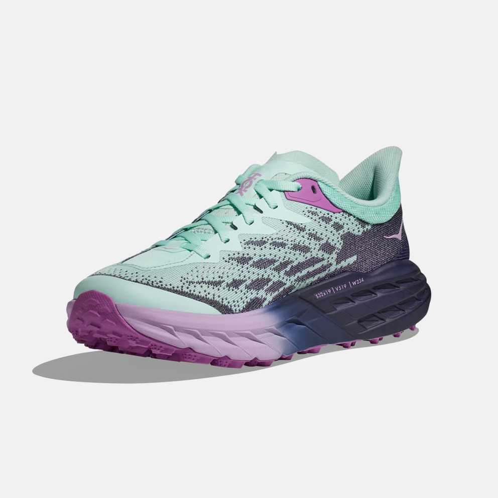 Made without the use of animal products and specially designed for trails and difficult trails, the Speedgoat 5 features Vibram® technology Megagrip for upgraded grip and improved performance. Vibram® Megagrip was developed specifically for demanding activities such as hiking, running or climbing, it is a high performance compound that provides excellent grip properties in wet, muddy, slippery and dry conditions surfaces. Wrapping around the toe and forefoot, a dynamic textile component provides exceptional flexibility and comfort during removal duration, a feature seen in the Mafate Speed 3, Evo Mafate 2 and Evo Speedgoat. The double layer jacquard mesh, ensures confidence on any terrain making this shoe the ideal choice even in the toughest conditions.