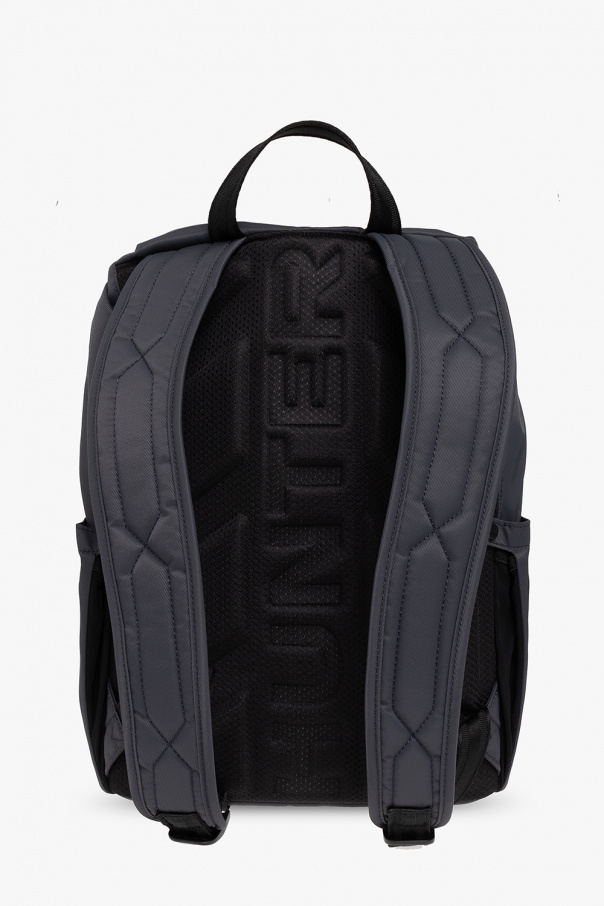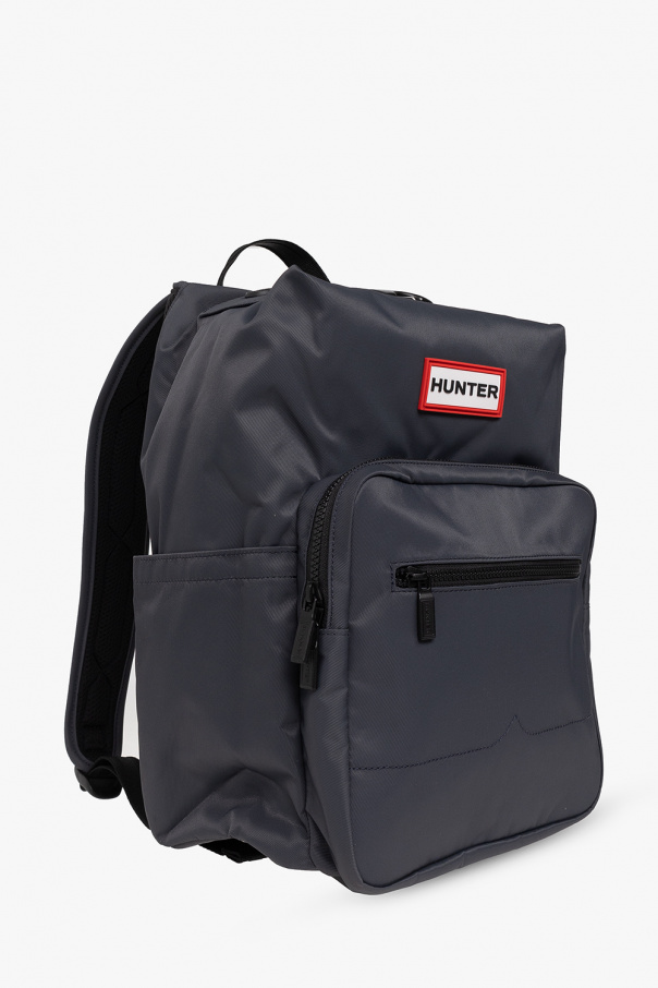 Navy backpack from Hunter. Made of recycled fabric, this model is complete with a zip and snap fastening, logo patch in white, red and black, half-round handle, two slip pockets, two zip pockets, adjustable shoulder straps, black metal hardware and one internal compartment with one slip pocket.