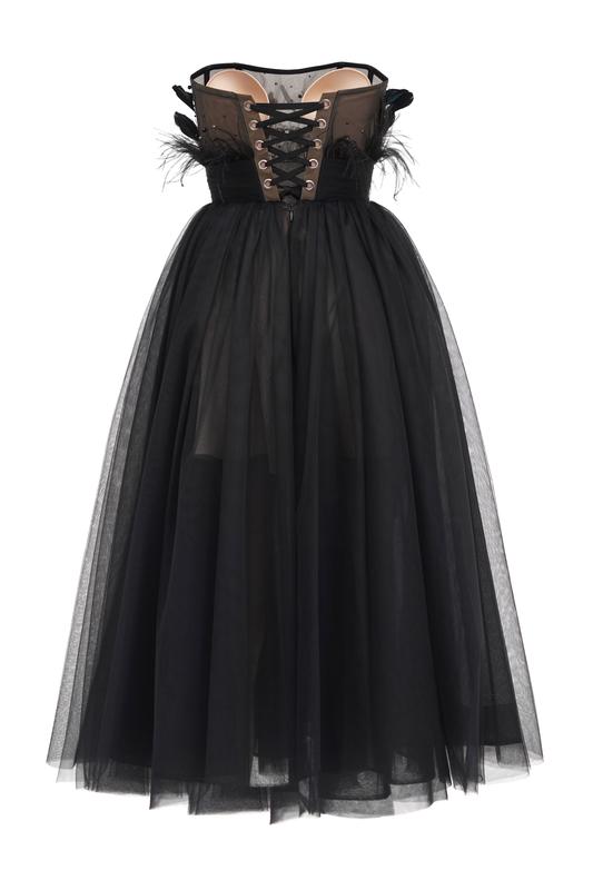 Коктейльна сукня Fidema з ніжноі сітки довжиною міді з відкритими плечима ,задекорована пір"ям та кришталем. Корсет має виріз у вигляді серця , ззаді на шнурівку. Талію підкреслює горизонтальне драпірування у вигляді пояса.