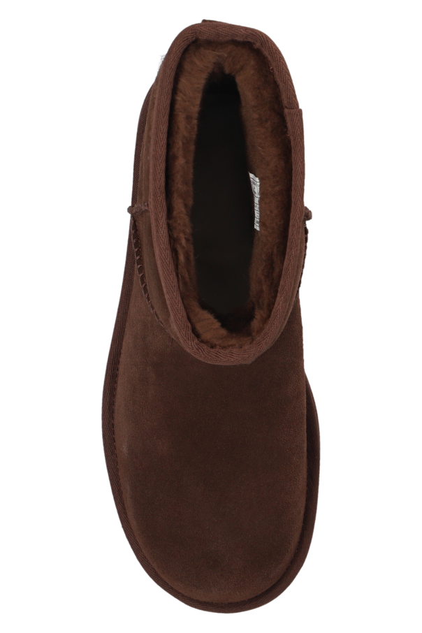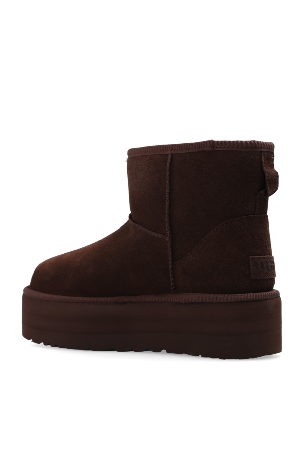 Dark brown ‘Classic Mini Platform’ snow boots from UGG. Made from suede and lined with UGGplush®, this model sits on a dark brown SugarSole™ outsole and features a logo patch on the back.