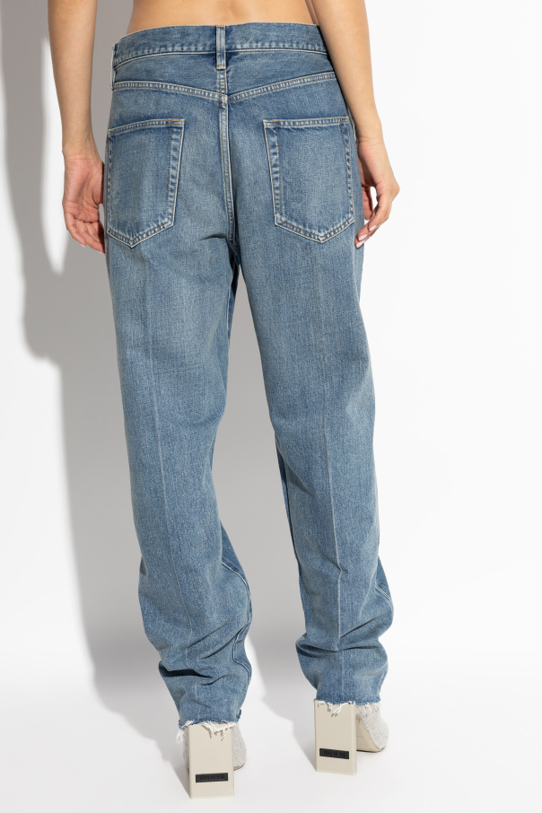 Introducing the Fear of God Logo Jeans from our exclusive collection. These jeans epitomize the perfect blend of luxury and casual elegance, crafted meticulously for the discerning fashion enthusiast. These jeans boast a boyfriend fit, offering a relaxed silhouette with a slightly tapered leg for a sophisticated yet nonchalant appeal. The high-waisted design accentuates your natural shape, while the classic non-stretch denim in a timeless blue hue imbues a vintage charm. Subtle distressing across the fabric lends a retro character, enhanced by the frayed hems that underline the casual, laid-back aesthetic. The jeans feature a front closure with a button and zip, and are adorned with a dark material logo patch from Fear of God on the waistband, asserting brand prestige. The design is completed with five pockets—two classic back pockets and three practical front pockets, including a coin pocket. Contrast stitching in a light color adds a touch of classic sophistication, while standard belt loops provide versatility for accessorizing. Why choose this product? Expertly crafted from 100% premium cotton for durability and comfort. Distinctive boyfriend fit with a high waist for a flattering silhouette. Timeless blue denim with subtle distressing for a stylish, vintage look. Practical and stylish with five functional pockets and frayed hems. Iconic Fear of God logo patch for an elite, designer touch.