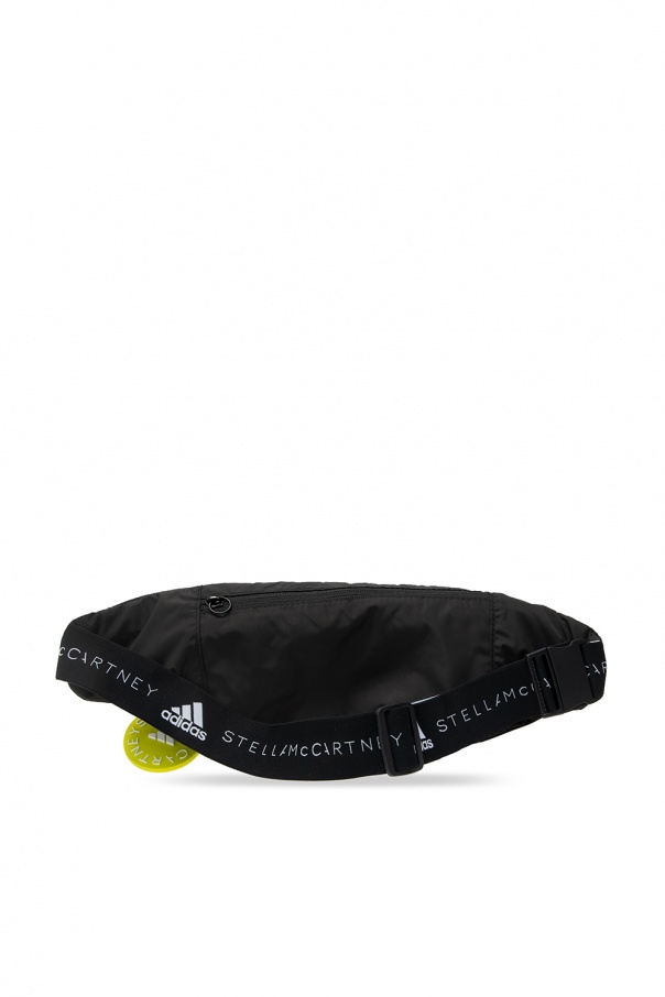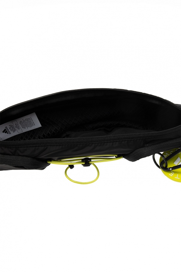 Black belt bag from ADIDAS by Stella McCartney. Crafted from recycled materials, this design features zip fastening, neon yellow drawstrings, logo print, two zip pockets, clip with a rubber logo charm, back zip pocket, adjustable elastic buckle strap and one internal compartment with two mesh pockets.