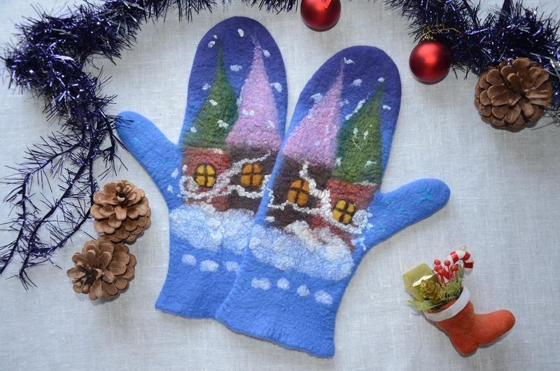 Валяные варежки васильково-синего цвета с переходом в фиолетовый со сказочными домиками!