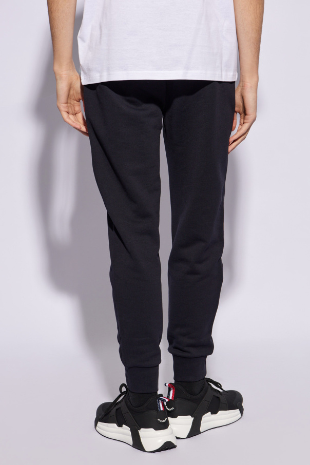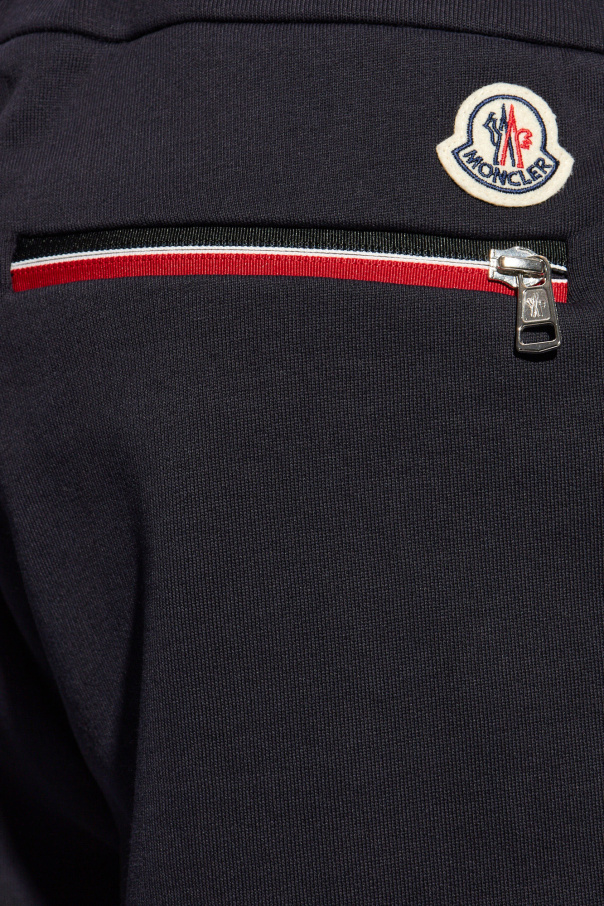 Navy blue sweatpants from Moncler. Made from cotton, this pair is cinched with drawstrings at the waist and features two frontal pockets, elasticated cuffs and one back zip pocket accompanied by a colourful logo patch.