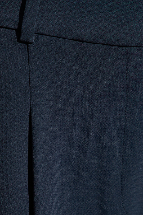 Navy blue trousers from Michael Michael Kors. Cut with a high-rise waist, this pair falls with wide, straight legs and features a zip fly with a button and hook, pleats on the front and four slip pockets.