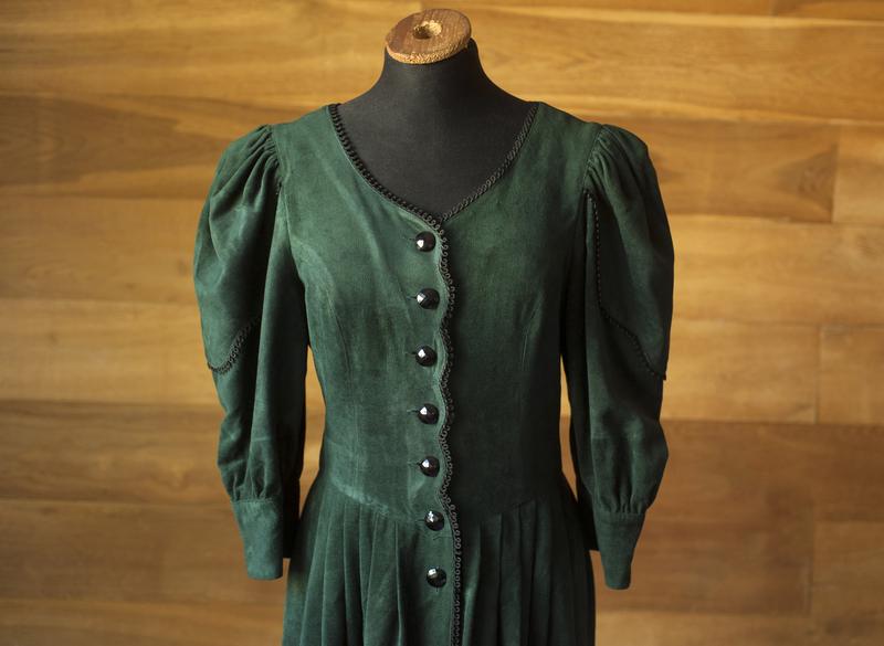 Неймовірно гарна темно зелена вінтажна сукня міді жіноча 80-х-90-х років німецького бренду Berwin&Wolff. В склад тканини входить віскоза. Тканина важка, візуально трішки нагадує оксамит. Має вишуканий глибокий зелений колір. Застібається спереду на декоративні гудзики. По бокам є кишені. Стан нової. Розмір вказаний 34, але сукня чудово підійде і на S розмір. Сукня неймовірної краси, в ній ви точно відчуєте себе королевою.