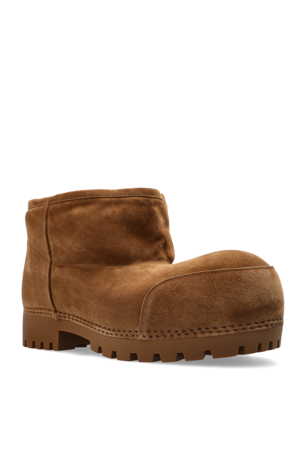 Introducing the Alaska snow boots by Balenciaga, an embodiment of sophistication and functionality. These masculine boots in an exquisite brown hue are crafted from the finest suede, bestowing an elegant and supple appearance. Their plush interior, lined with white faux fur, offers unparalleled warmth, making them an impeccable choice for winter's harsh embrace. The Alaska snow boots feature a robust, rounded front and a low-profile shaft, exuding a solid yet cozy aura. The gum outsole, with its pronounced tread, ensures superior grip on icy terrains, marrying practicality with the high-fashion ethos synonymous with Balenciaga. An understated designer insignia graces the heel, a testament to the boot's exclusive nature. In homage to the legacy of Cristóbal Balenciaga, these boots merge haute couture craftsmanship with modern-day style, echoing the visionary spirit that has defined the brand since 1917. Dlaczego warto kupić ten produkt? Crafted from luxurious suede for an elegant look. Plush interior ensures warmth and comfort. Durable gum outsole with excellent traction. Subtle designer branding for exclusivity. A perfect blend of fashion and functionality.