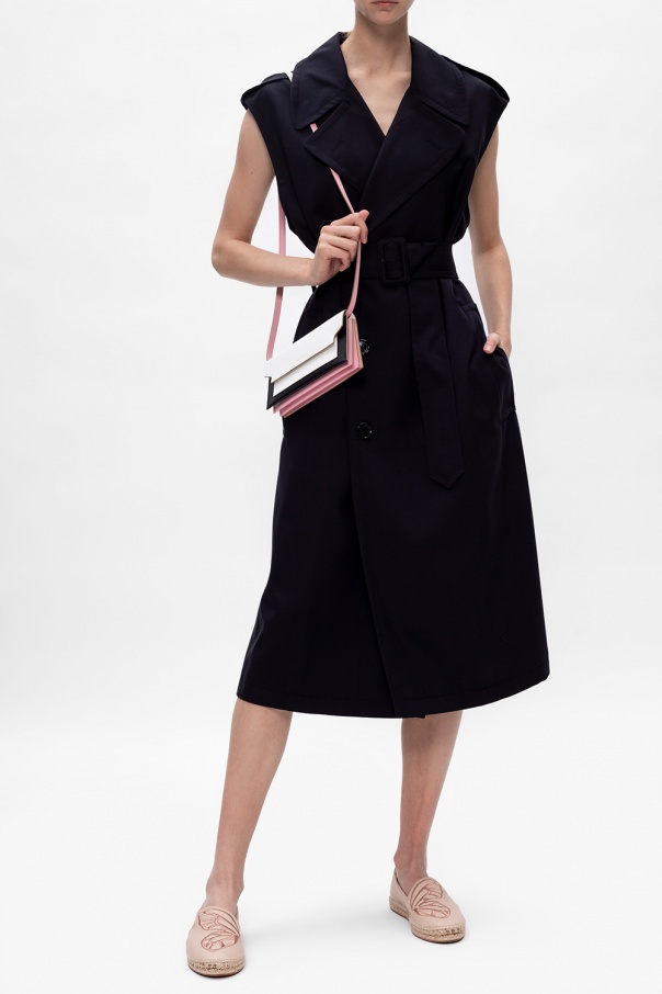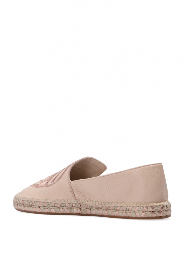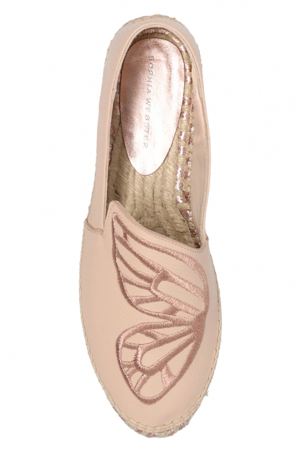 Beige espadrilles from Sophia Webster. Crafted from leather, this slip-on design features an embroidered butterfly motif in pink and a rubber sole in beige and pink.