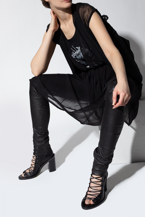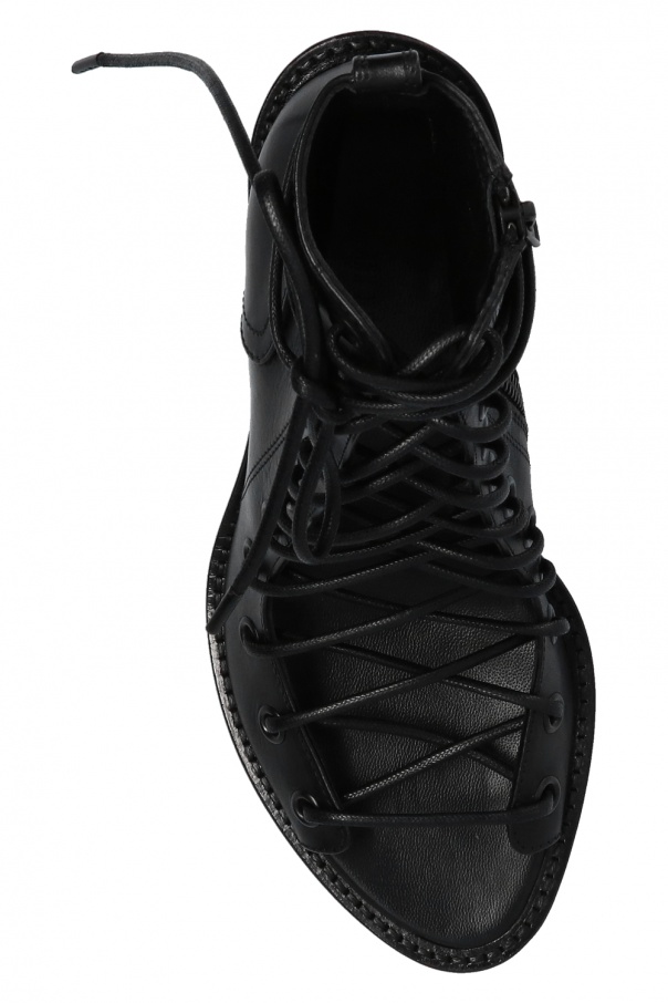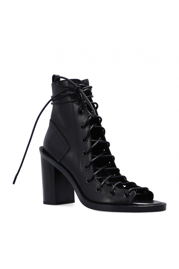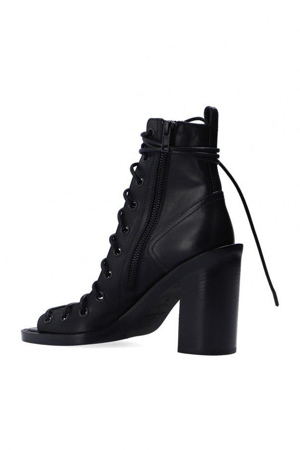 Black heeled ankle boots from Ann Demeulemeester. Crafted from leather, this lace-up model features a side zip closure, open toe and black leather sole.